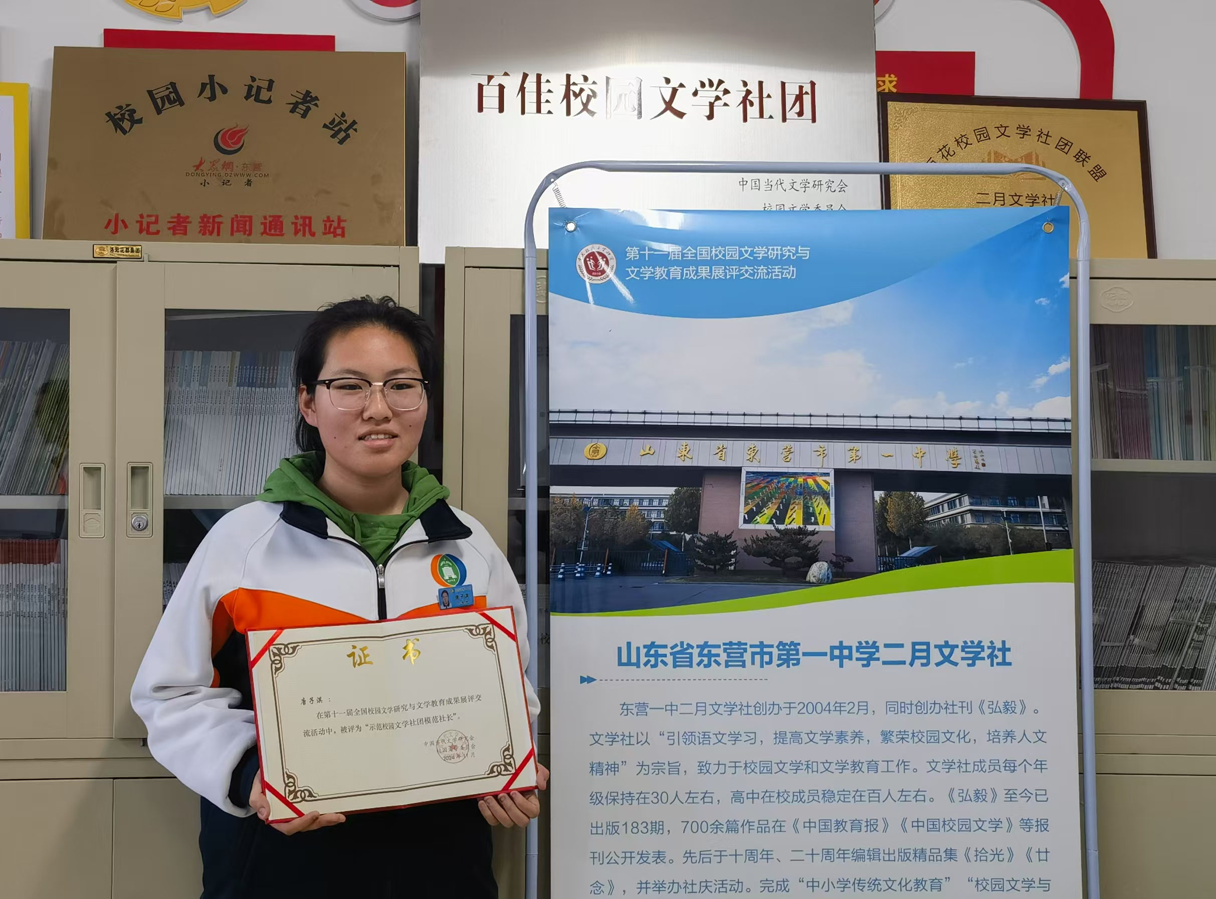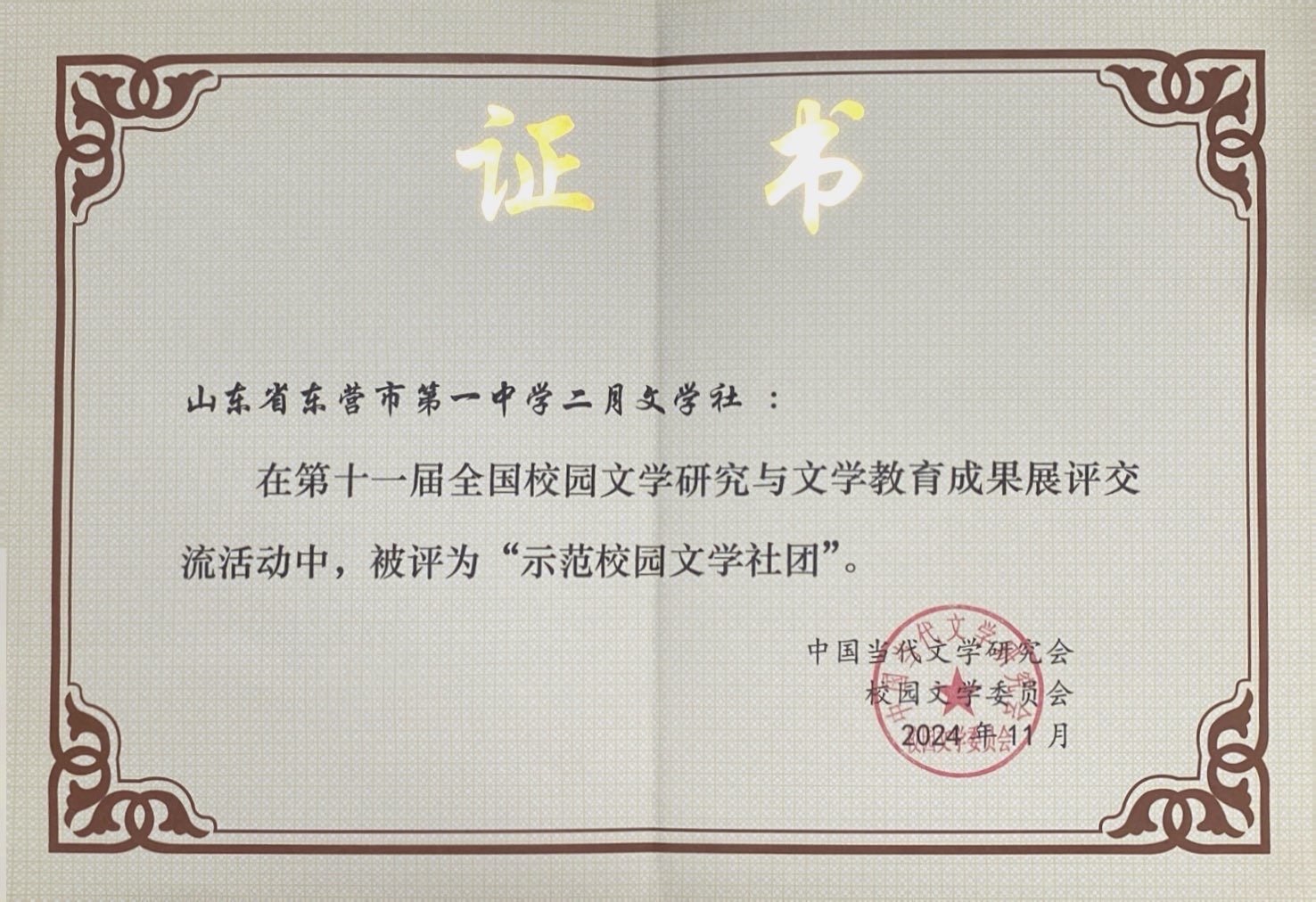 东营市一中二月文学社已度过二十年青春韶华,社员的文章频见于各类报刊,文学社主编的社刊《弘毅》在师生中深受欢迎,在当地中小学知名度颇高,是一支有着优良传承、广泛影响的学生社团。曾多次荣获全国优秀校园文学社团、示范校园文学社团等荣誉。
