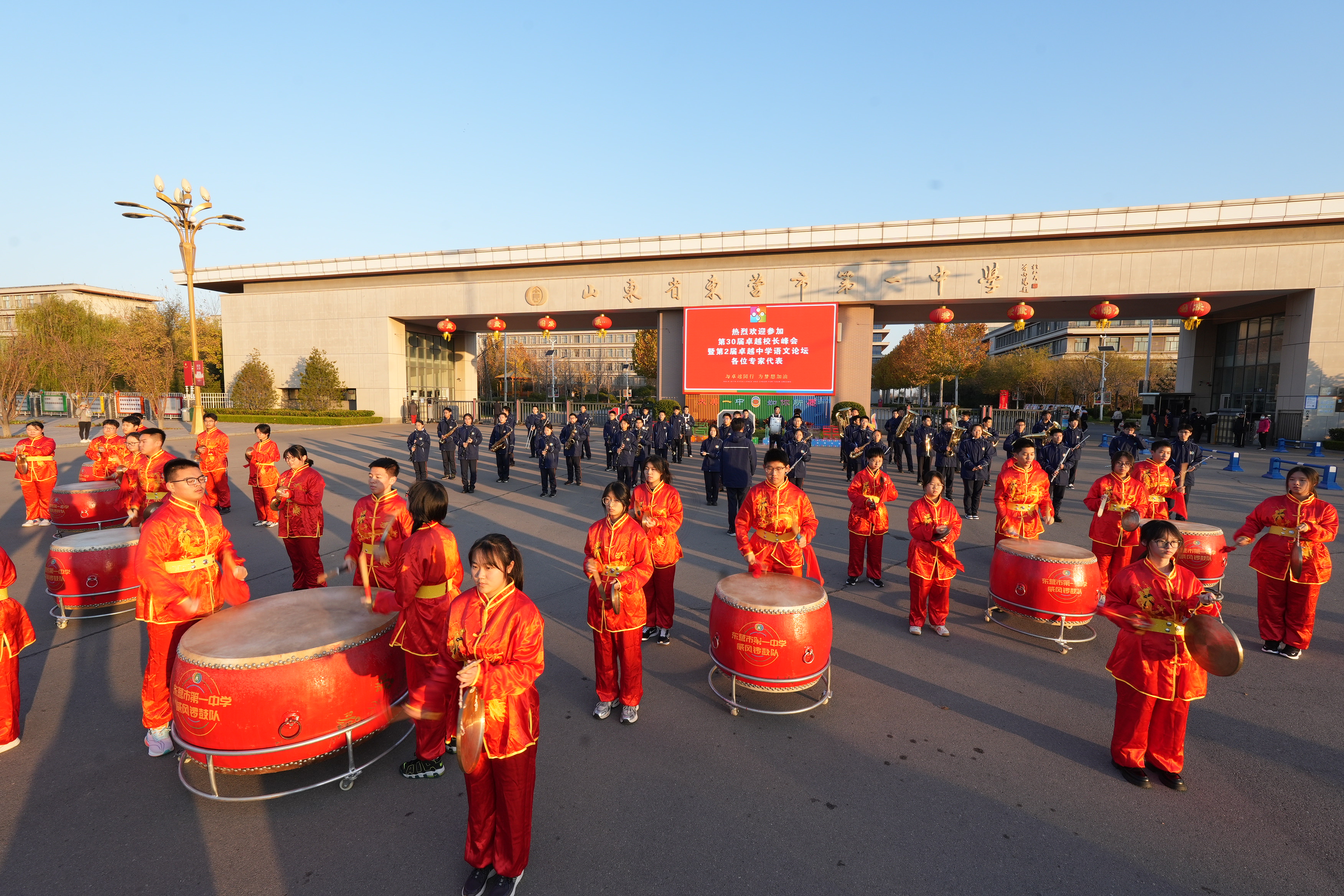 在学校南大门,两支学生社团队伍——威风锣鼓队和一鸣管乐队共同奏响迎宾曲,迎接来自全国天南海北的宾客。