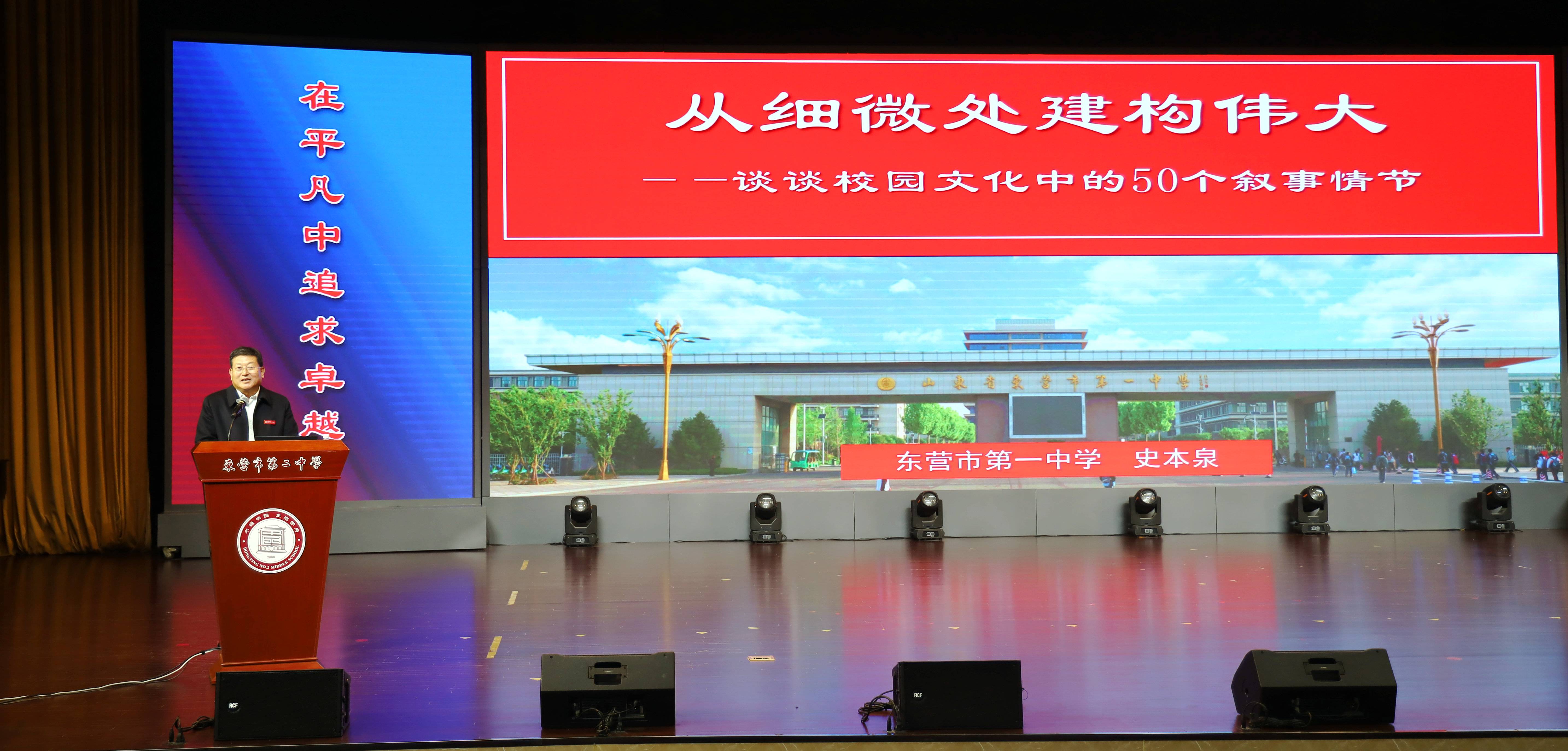 12月4日,我校党委书记、校长史本泉应邀到东营市二中作校园文化专题报告。史本泉校长以《从细微处建构伟大》为题,从育人的温度、管理的精度、师资的高度、活动的广度、课程的宽度、文化的深度、校长引领的高度、学校美誉度等八个方面,围绕教育教学中的50个叙事情节,深入浅出地为全校教职工做了一场精彩的报告。报告会由市二中党委副书记、校长马占武主持。