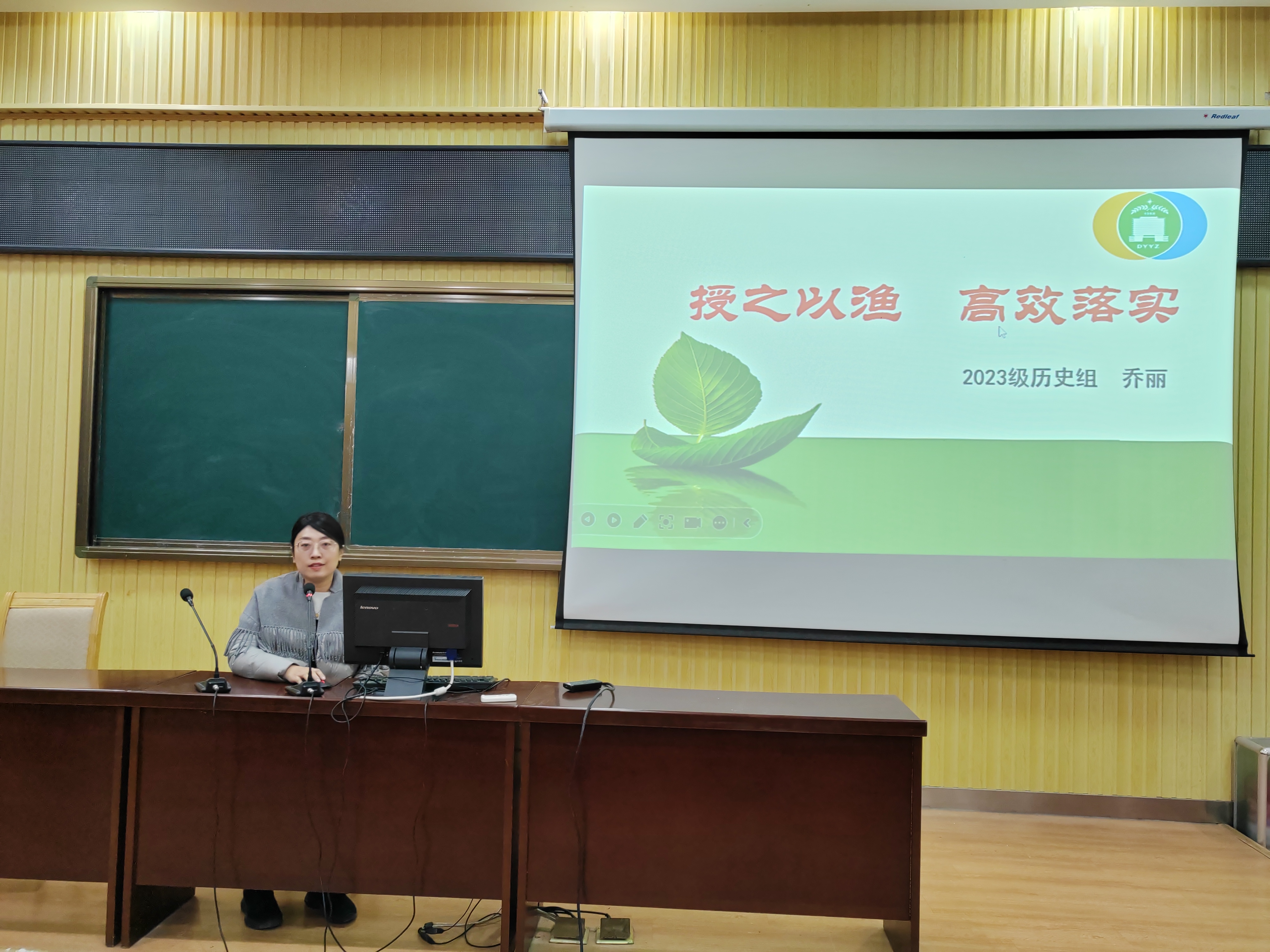 历史组教师乔丽从备课的“四有原则”、课堂的高效原则、落实的全面原则三个方面,做了题为“授之以渔 高效落实”的报告。乔老师重点谈到:“目中有人——把握学情。通过学生的课堂表现和日常练习,对学生在知识、能力、习惯等方面进行全面把脉,并对不同层次学生进行分类,备课时抓住学生的短板,缺什么补什么,哪里不行讲哪里,并分阶段、分主题的进行精准施教、强化训练。”