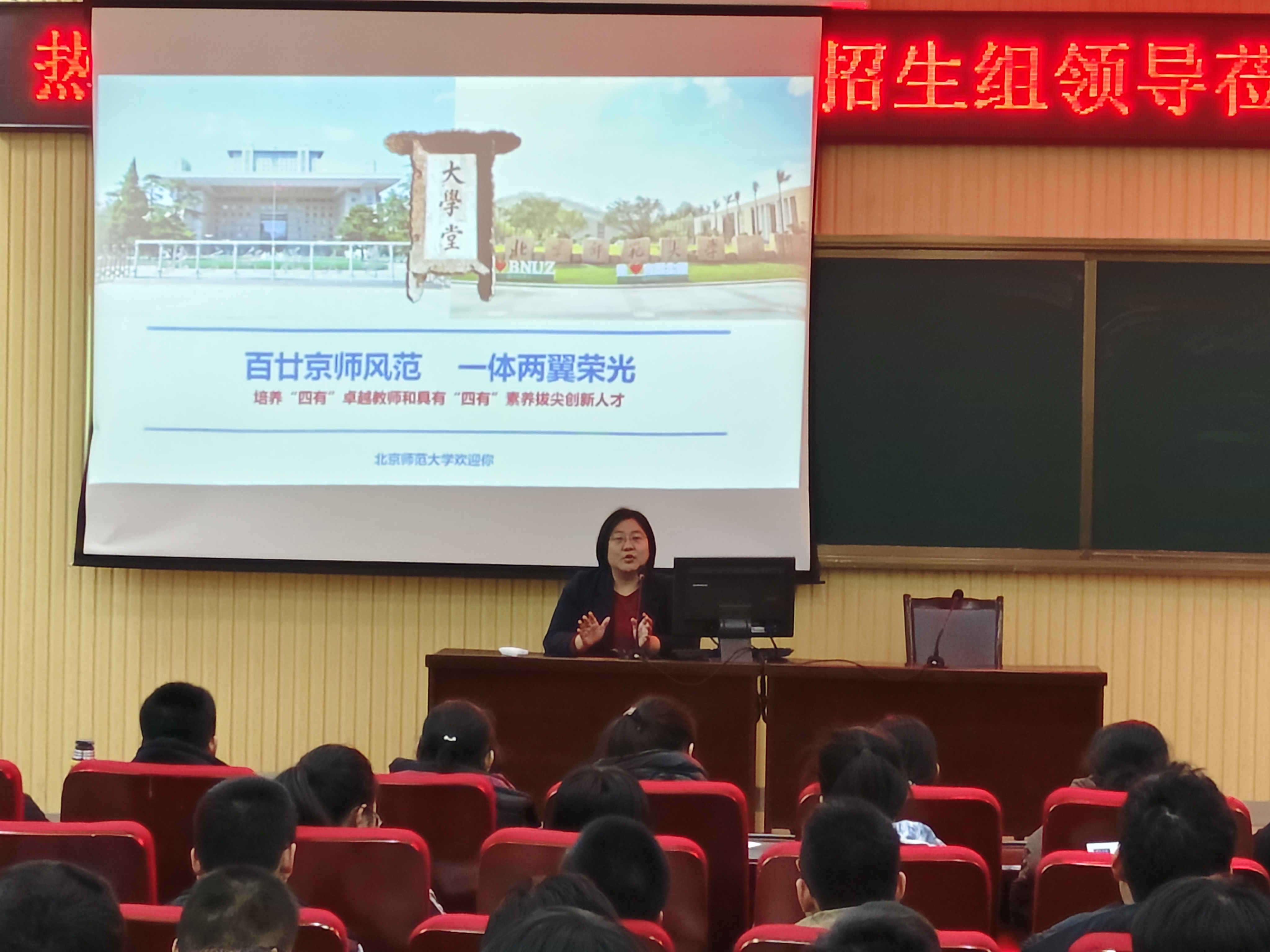 在光远楼阶梯教室,北京师范大学山东招生组组长、政府管理学院副院长果佳向我校学生作了题为《百廿京师风范 一体两翼荣光》的专题报告。此次报告不仅展示了北京师范大学的历史与文化,还详细介绍了学校的办学理念和未来发展方向,受到了广大师生的热烈欢迎。