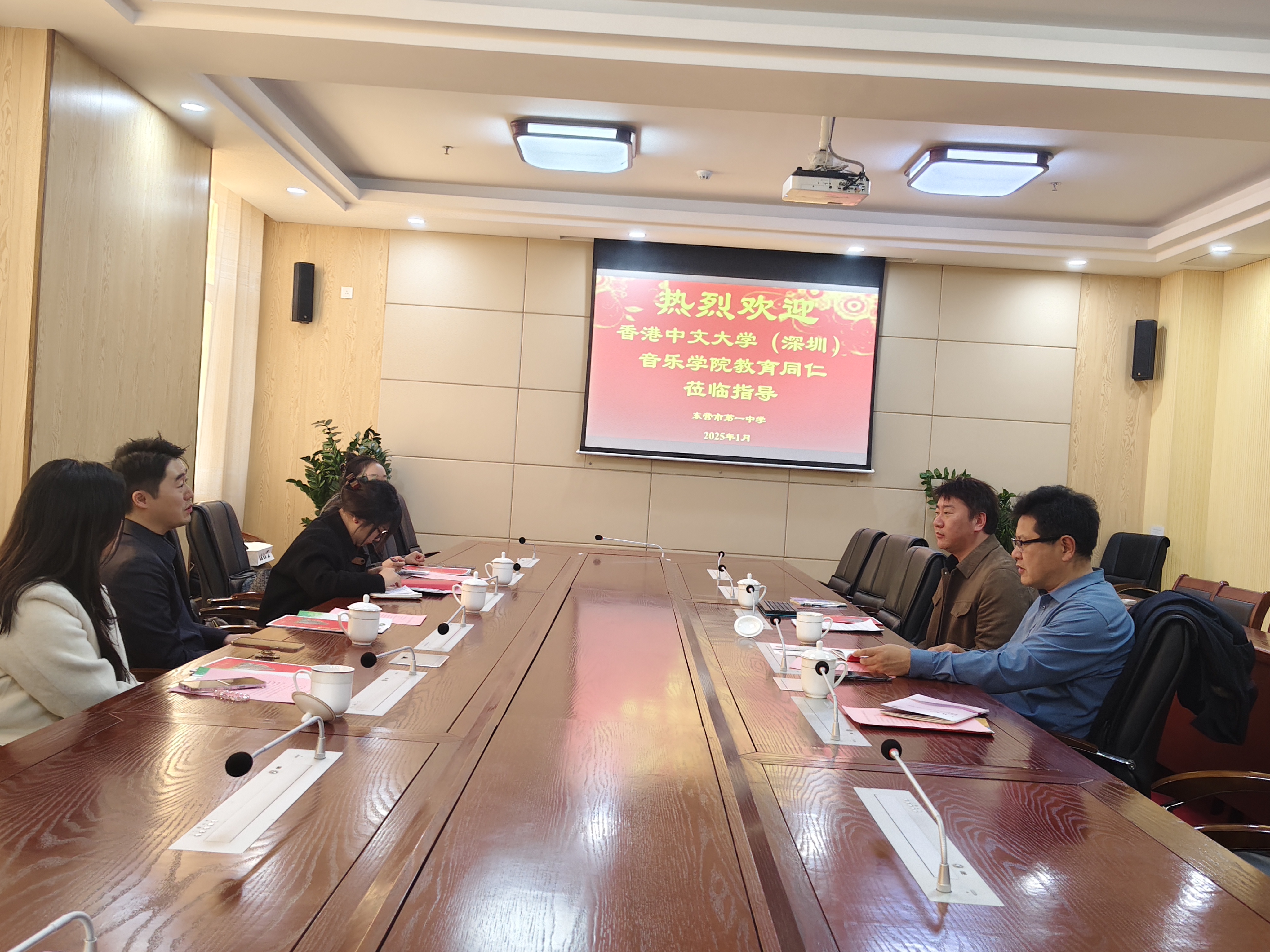 在行政楼第一会议室,双方围绕音乐特长生的培养展开了深入交流并分享了在音乐教育方面的经验和资源。香港中文大学(深圳)音乐学院演出与艺术实践主任朱千峰详细介绍了学院的师资力量、专业设置及招生政策。我校音乐教研组组长何志伟老师参加了交流座谈会并向来访同仁详细介绍了我校音乐特长生的培养情况及近几年的高考录取情况。