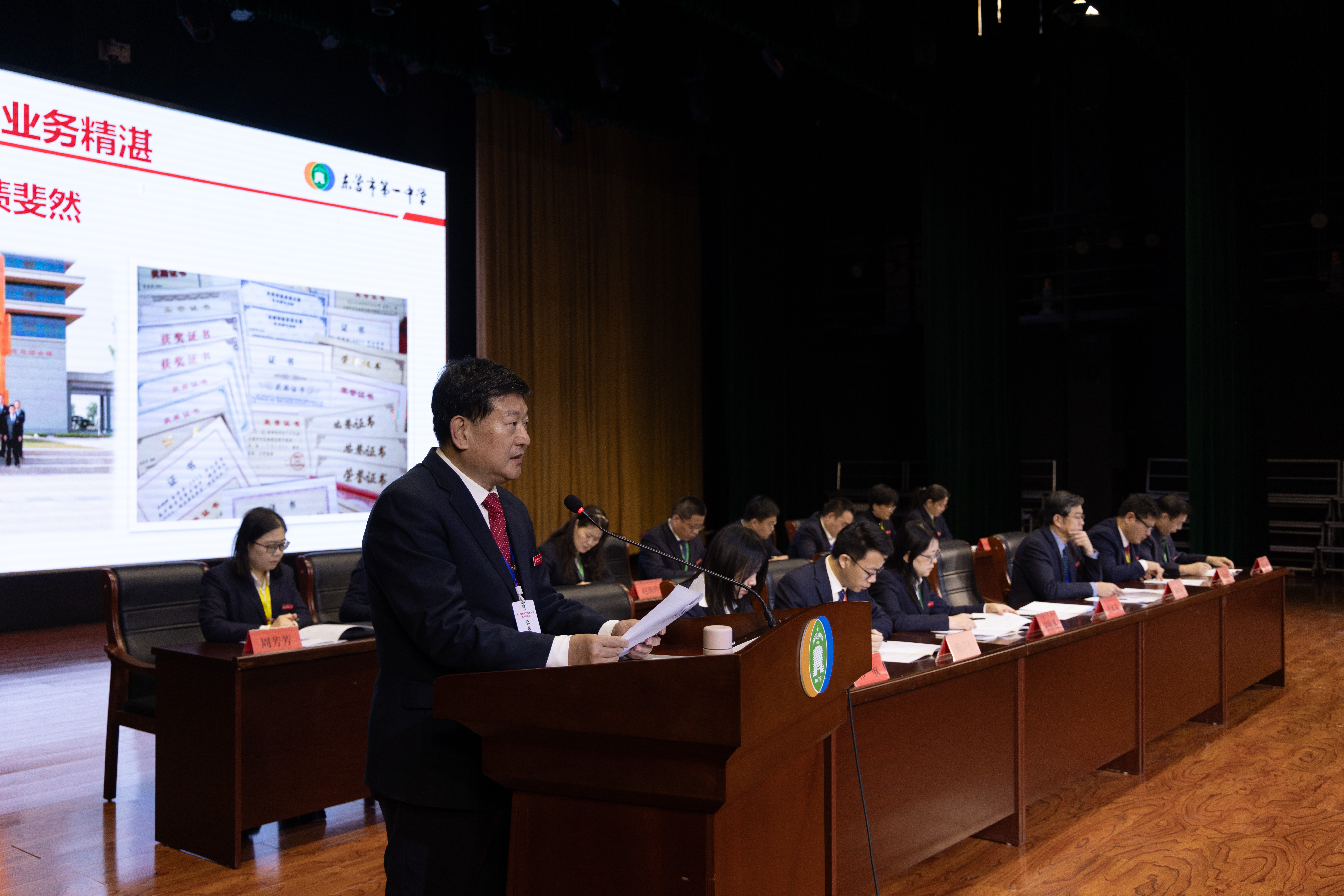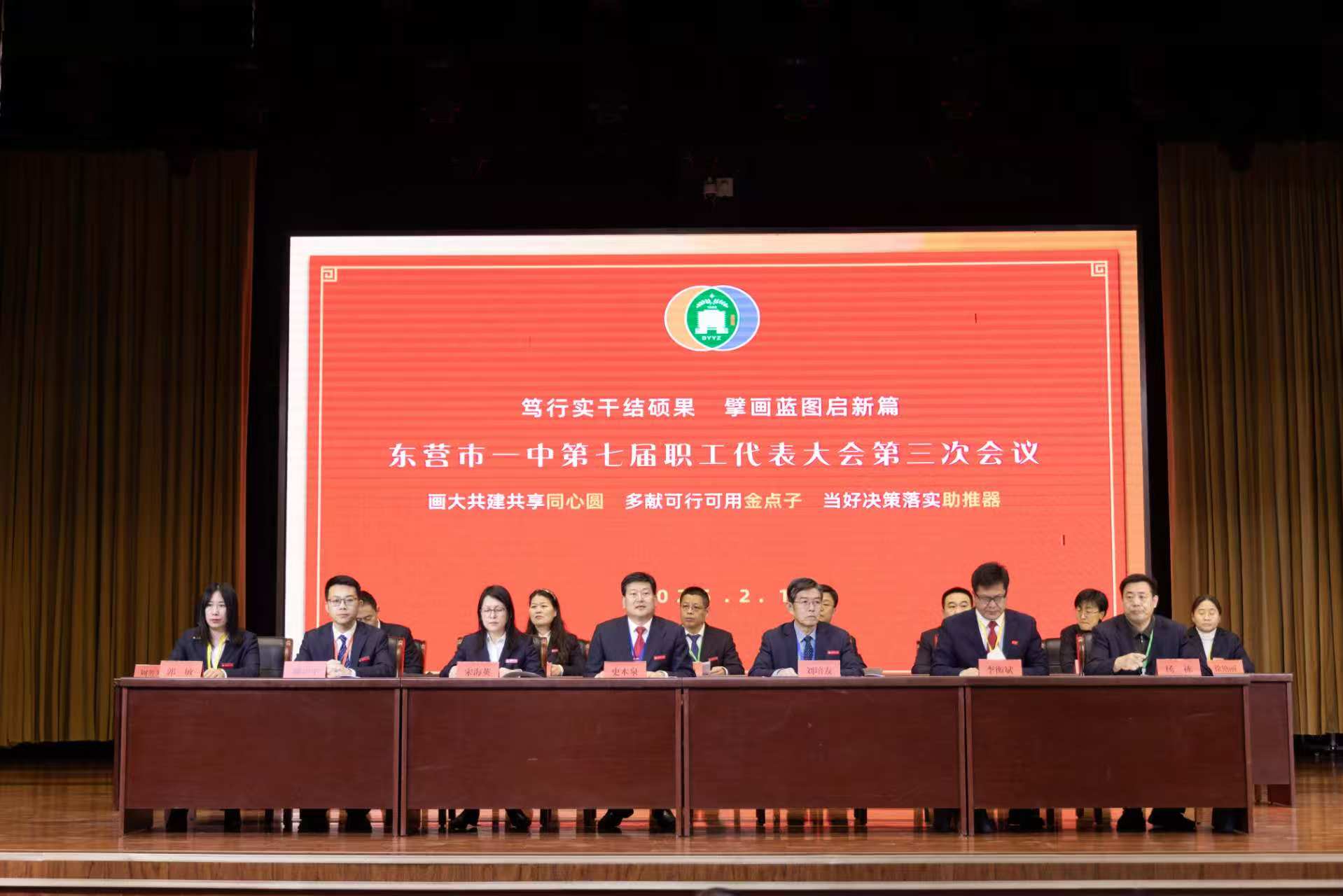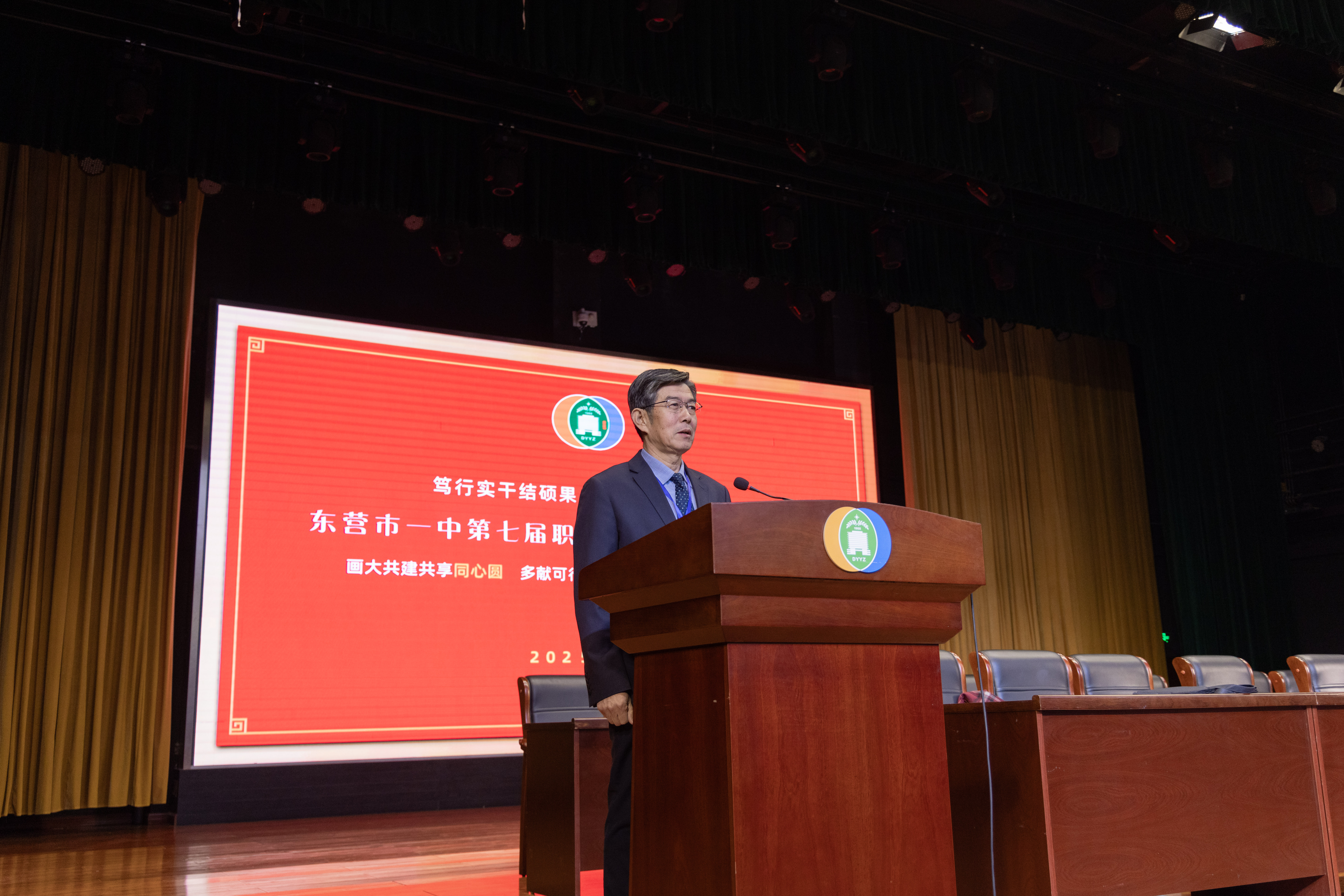 为进一步提高学校民主建设和管理水平,激发全体教职工的责任意识,提高学校决策民主化、科学化水平,凝聚学校的向心力,提质增效,加快推进学校创新发展,2月10日上午,东营市第一中学隆重召开第七届第三次教职工代表大会,全校教职工齐聚道德讲堂,共商学校发展大计。学校党委书记、校长史本泉作学校工作报告。