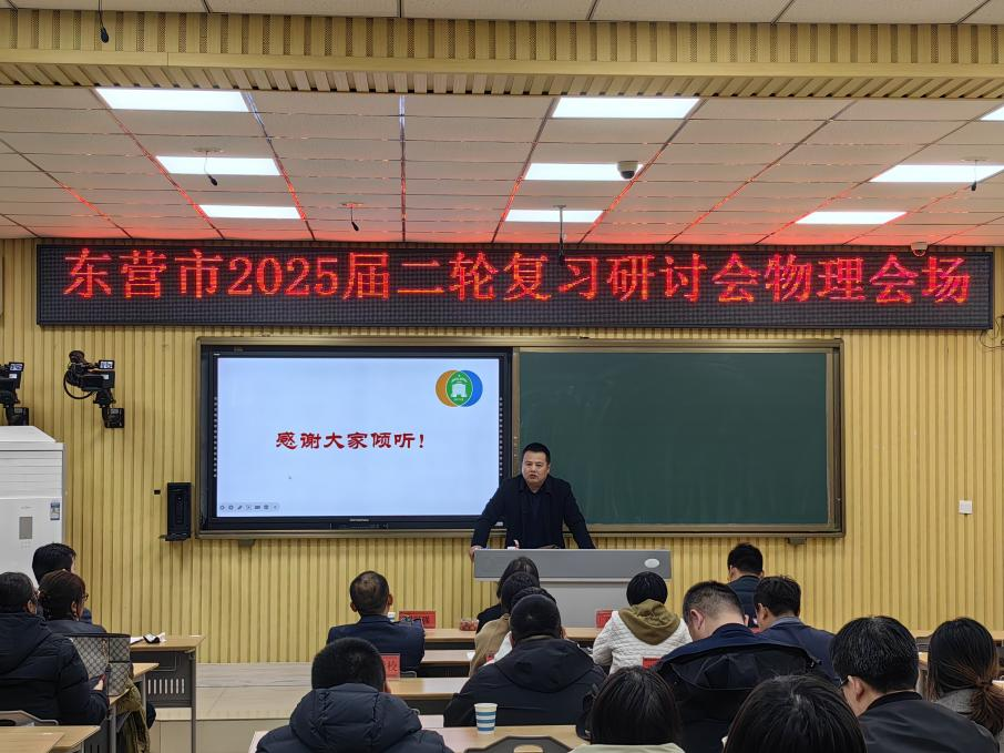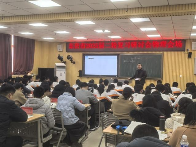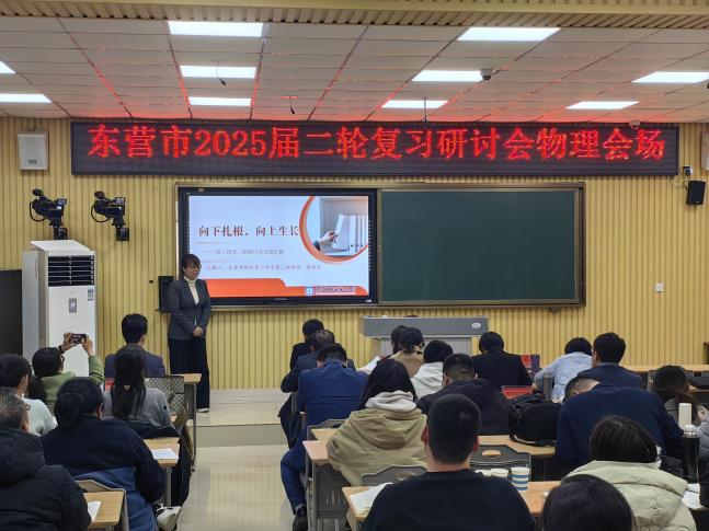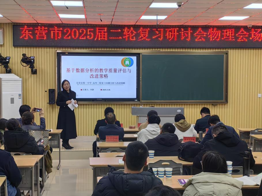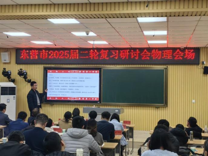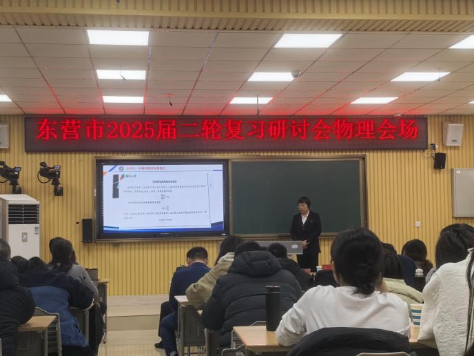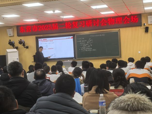 为科学高效备战2025年高考,巩固一轮复习成果,优化二轮复习方案,提高高三物理复习的有效性、时效性,3月18日,全市高中二轮复习研讨专题会在我校举行,东营市教科院刘兴强主任、物理教研员李静、全市各高中高三物理教师代表以及我校全体物理教师参加了本次研讨会。