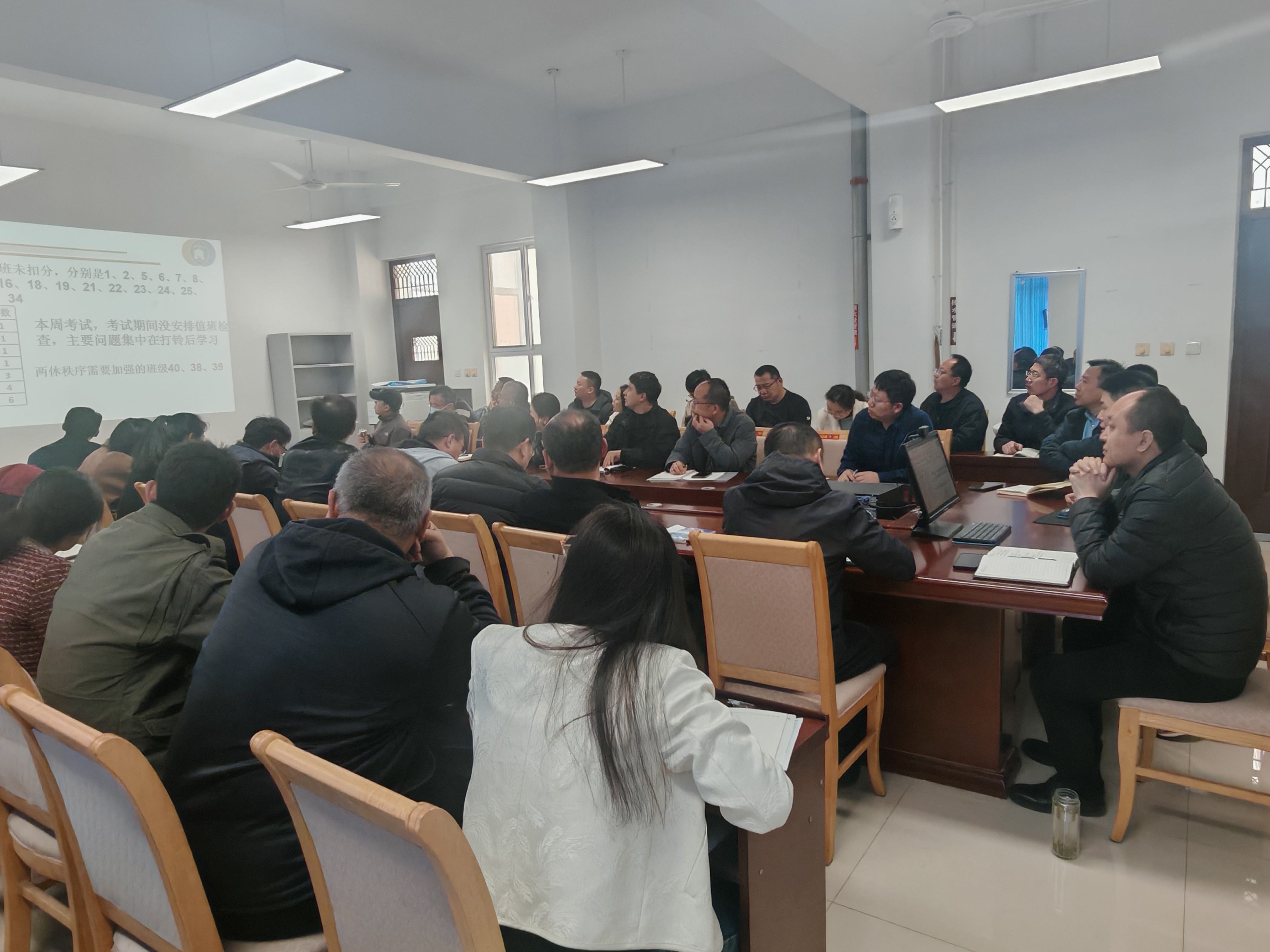 于程予老师就本周各班级的教学区、餐厅和宿舍内务卫生、宿舍两休秩序进行通报。18班在本次考试中整体成绩卓越,班主任黄海龙老师从任课教师和楼层班主任互相配合、家校协作、抓好日常制度建设以及挖掘学生内驱力等多方面进行经验分享介绍。黄老师认为,日常规章制度是班级有效运行的可靠保证。班级从考勤、课堂纪律到作业规范都形成了一套行之有效的规章制度,为班级优异成绩的取得奠定良好保证。