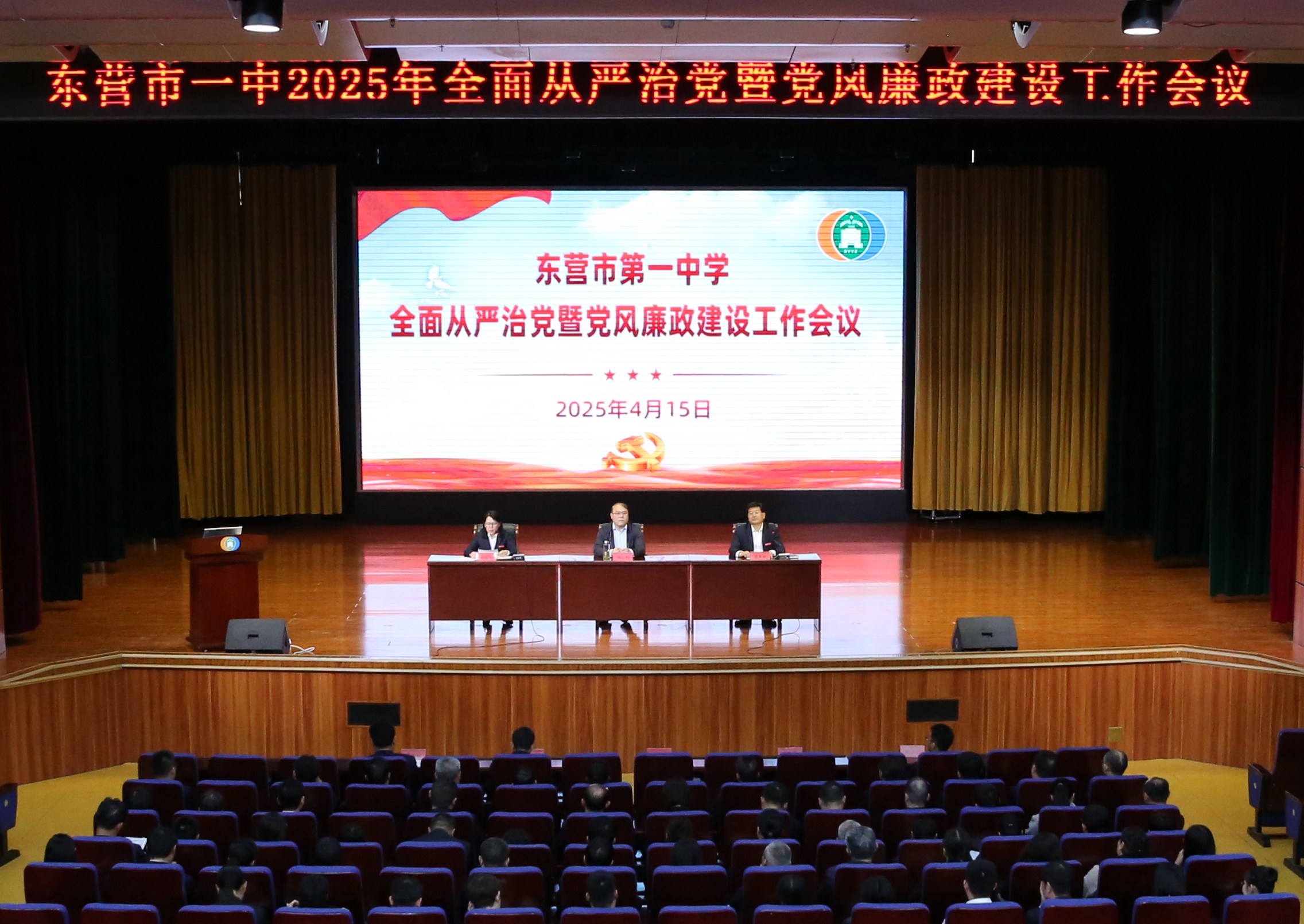 4月15日,东营市第一中学2025年度全面从严治党暨党风廉政建设工作会议在道德讲堂召开。市纪委监委派驻第七纪检监察组组长刘志利到会指导,学校党委书记、校长史本泉出席会议并讲话,学校党委班子成员、全体党员和部分教职工参加会议。党委委员、纪委书记宋海英主持会议。