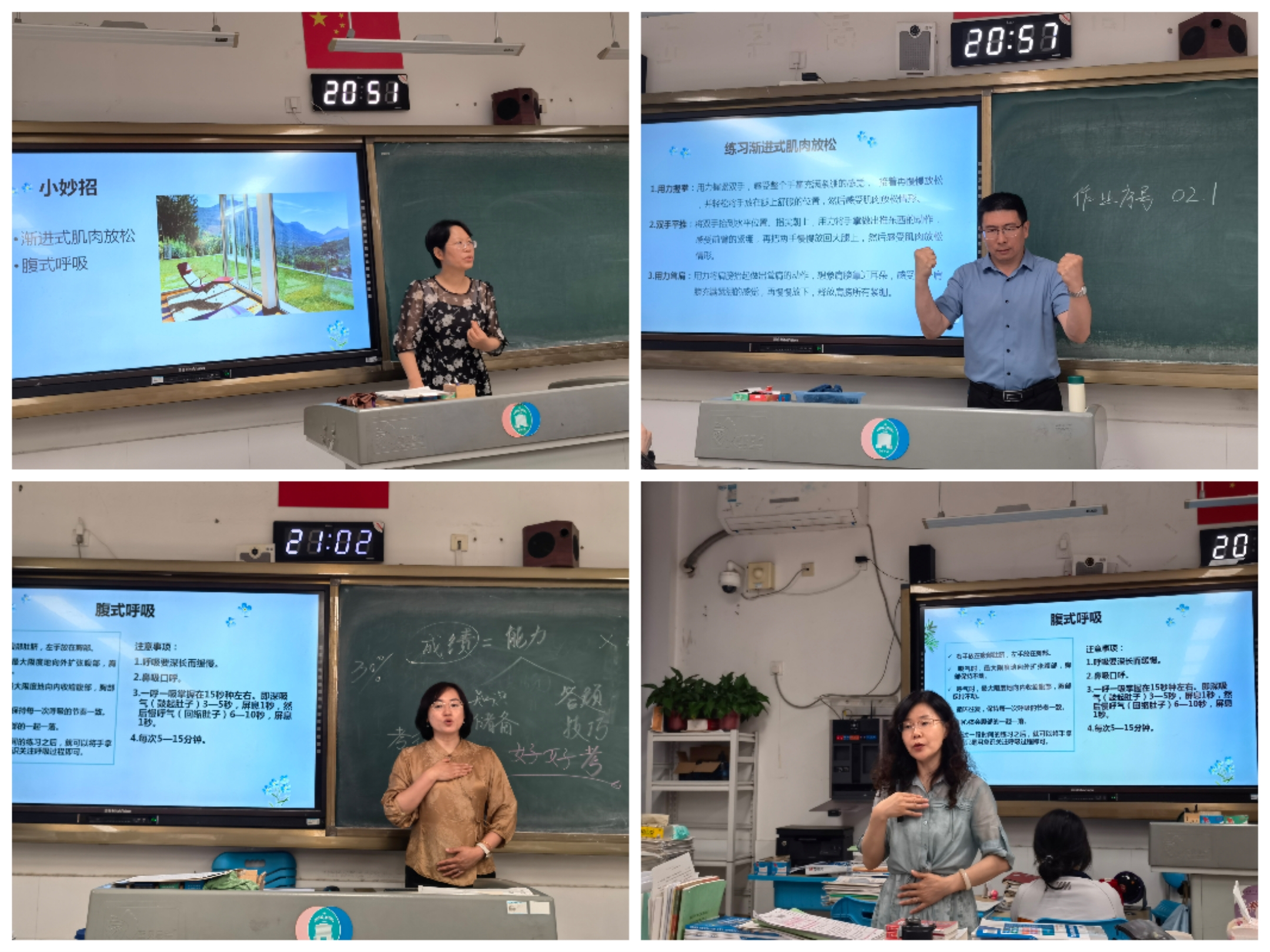 心理课上,老师们从学生自己最关注的高考冲刺前的感觉引导学生关注自我内心感受,然后告诉学生,除了身体状态、关系状态,情绪状态也是影响学习效果和考试成绩的因素。从而提醒学生学会渐进式肌肉放松和腹式呼吸,先从身体上找到不紧绷的感觉;然后进行乐观的心理预演,可以辅助蝴蝶拍等小技巧,给自己积极的心理暗示。