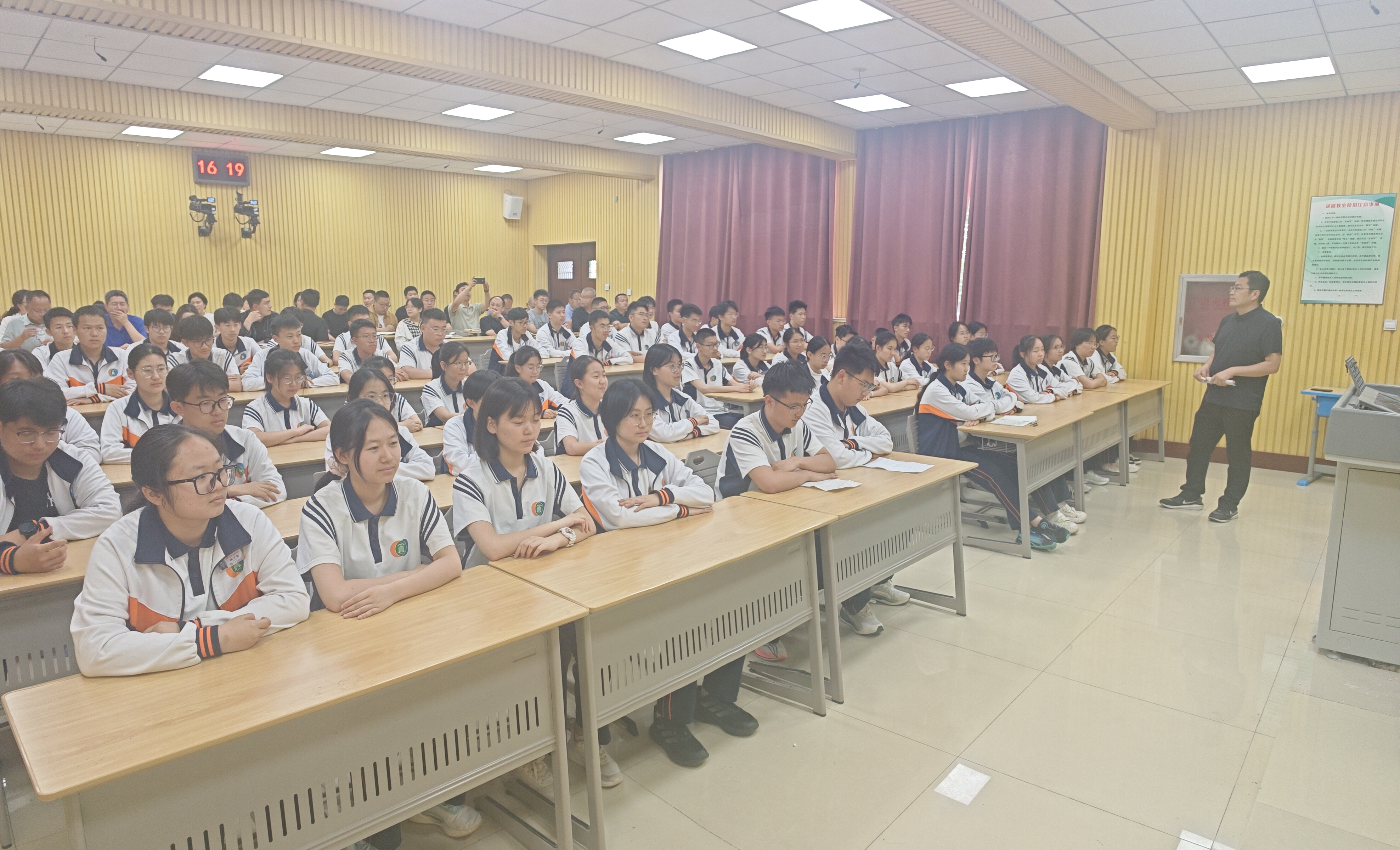 刘文星老师以“须知少时凌云志,曾许人间第一流”为班会主题,他首先分析了班级总体学习情况。各科平均分均保持较高水平,展现了班级扎实的学习基础。通过四次阶段性成绩的纵向对比,班级整体呈现稳中有进的趋势。随后,刘老师宣读了班级的“卓越之星”“单科之星”和“进步之星”名单,鼓励所有同学向先进榜样看齐,同时以钱伟长、华罗庚等科学家的奋斗事迹激励学生,强调“勤奋是制胜法宝,信仰是成功基石”,呼吁学生以坚定的想信念享受学习过程。本次观摩班会,刘老师安排了班级卓越之星、进步之星和优秀宿舍长代表做了典型发言。他们详细介绍了自己在学习方法、目标设定和碎片化时间利用等方面的经验,通过生动的案例和可操作的技巧,展现了高效学习与自我管理的实践路径。.jpg)