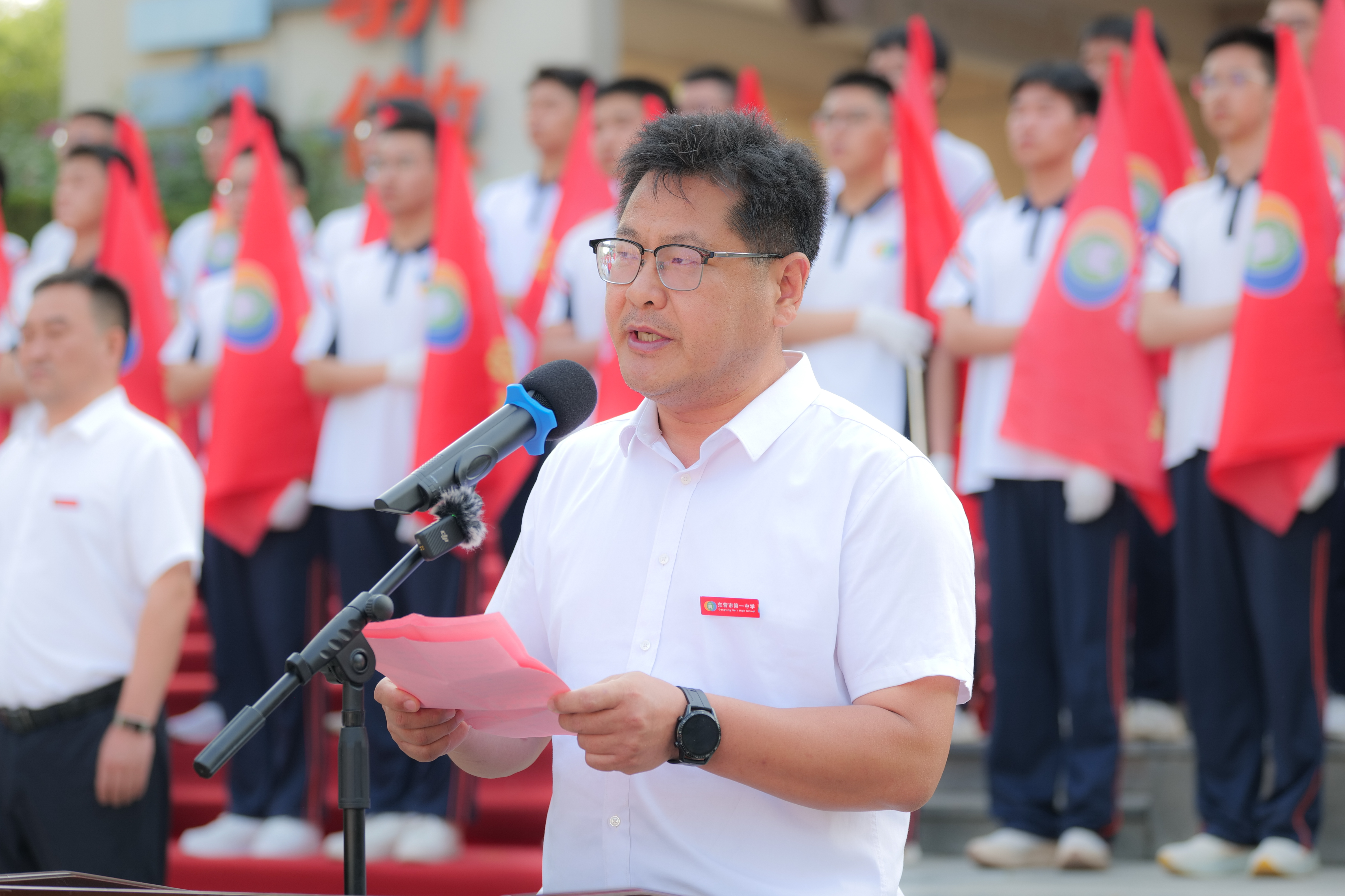 班旗是班集体的魂魄,凝聚着班级的初心使命,是砥砺前行的精神旗帜!在催人奋进的乐曲声中,学校党委书记、校长史本泉为各班授旗,各班旗手在统一口令中展示班旗。