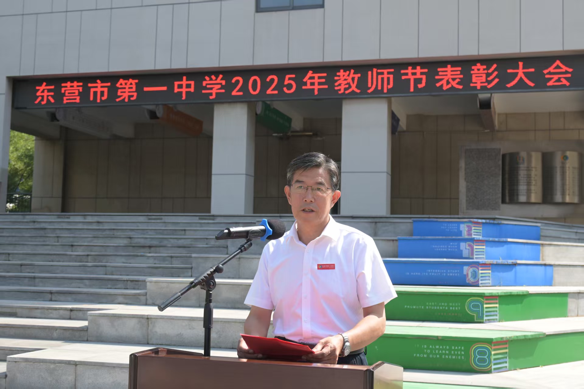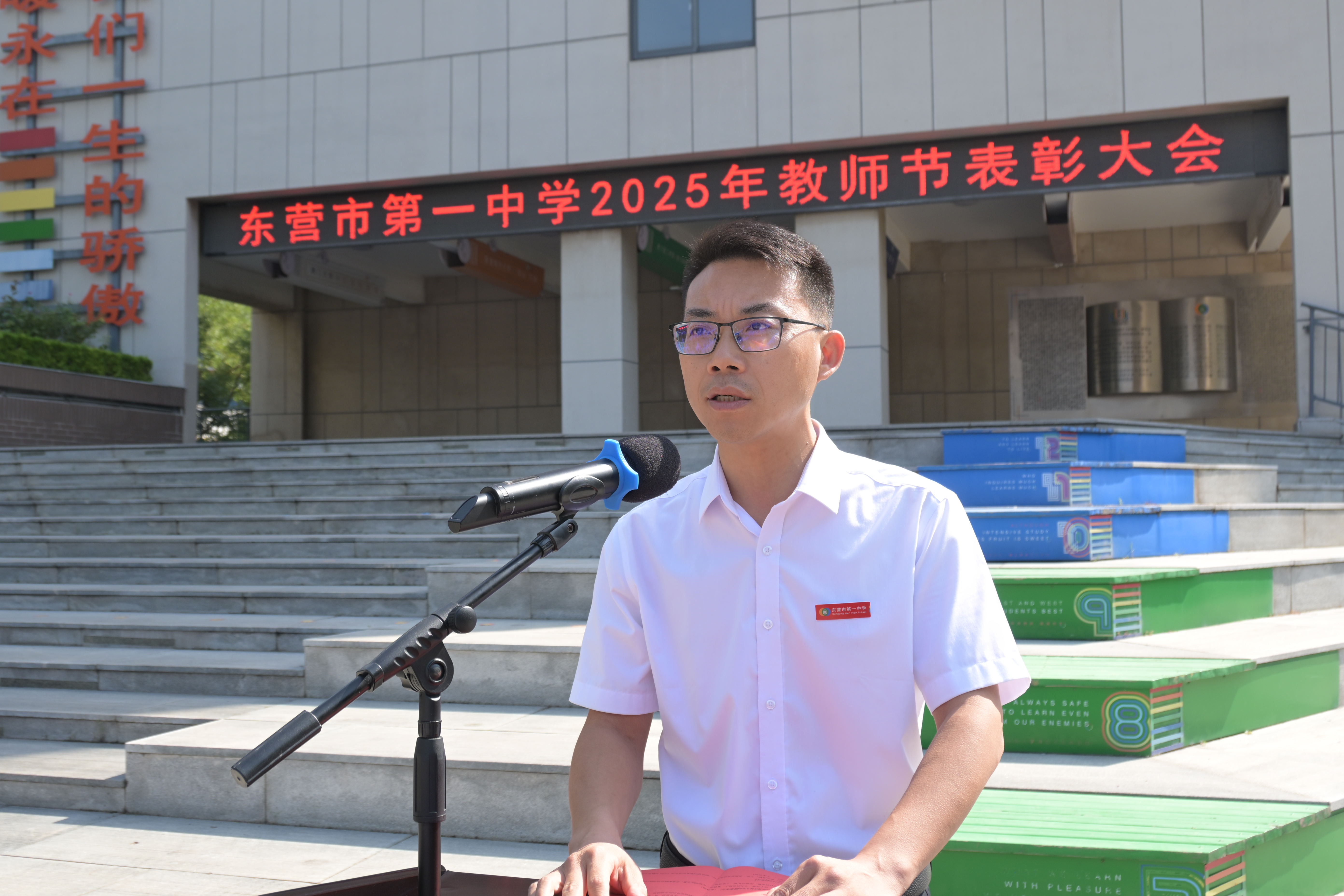 在金秋送爽、硕果盈枝的美好时节,东营市第一中学隆重举行优秀教师表彰活动,对过去一学年在各自岗位上表现卓越、贡献突出的教职工予以嘉奖。参加活动的有学校领导班子成员及我校部分优秀校友,他们共同为老师们庆祝节日。学校党委委员、副校长赖声平主持仪式。