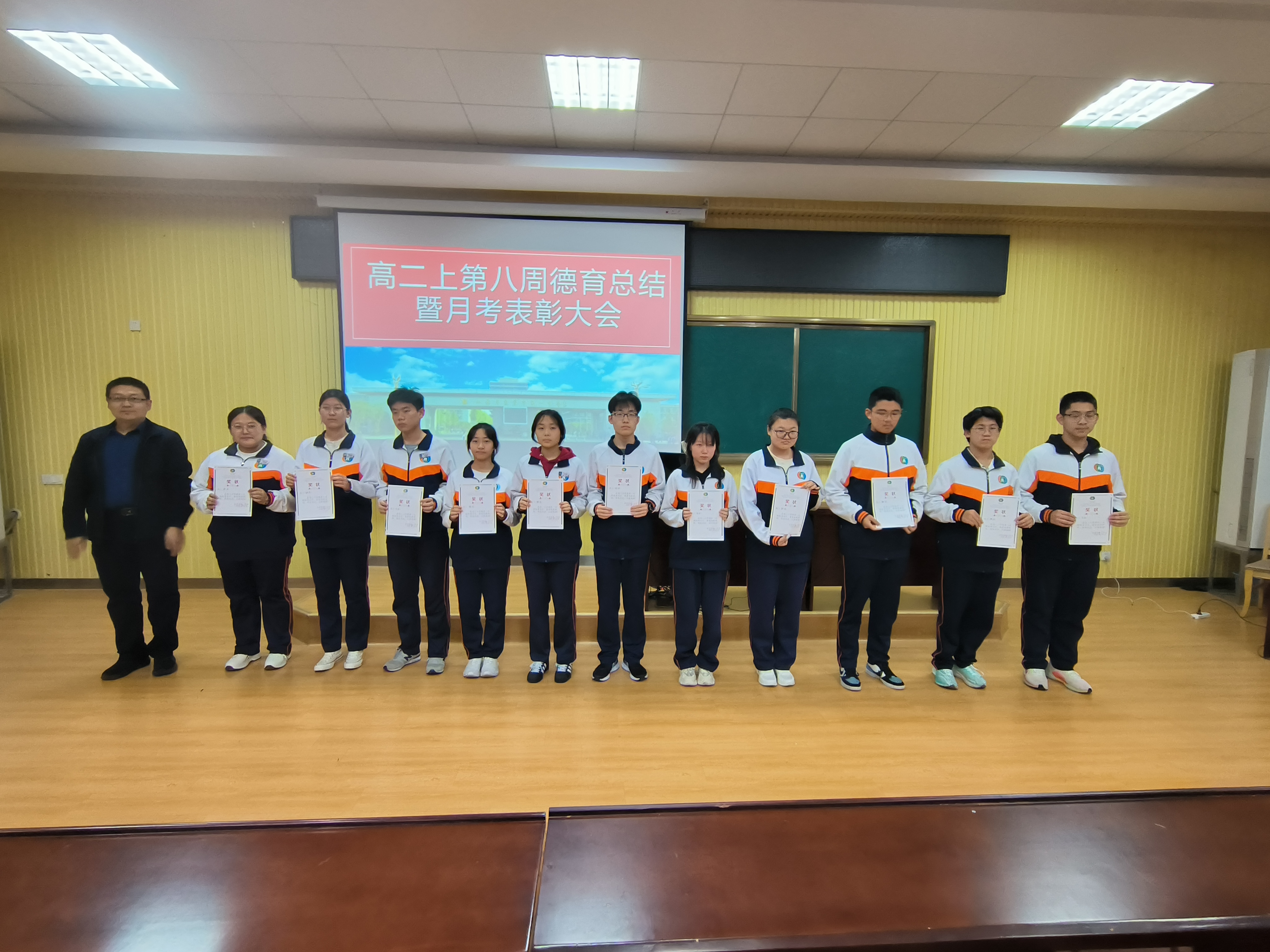 首先刘杰主任宣读了月考表彰决定,对在本次考试中表现突出的“优胜班级”与“卓越之星”予以通报表扬。在激昂的颁奖音乐中,孟磊、厉彦明、姬中敏等依次为获奖学生代表颁奖。一张张奖状,不仅是对他们勤奋付出的肯定,更是对全体同学的激励与召唤。.jpg)
