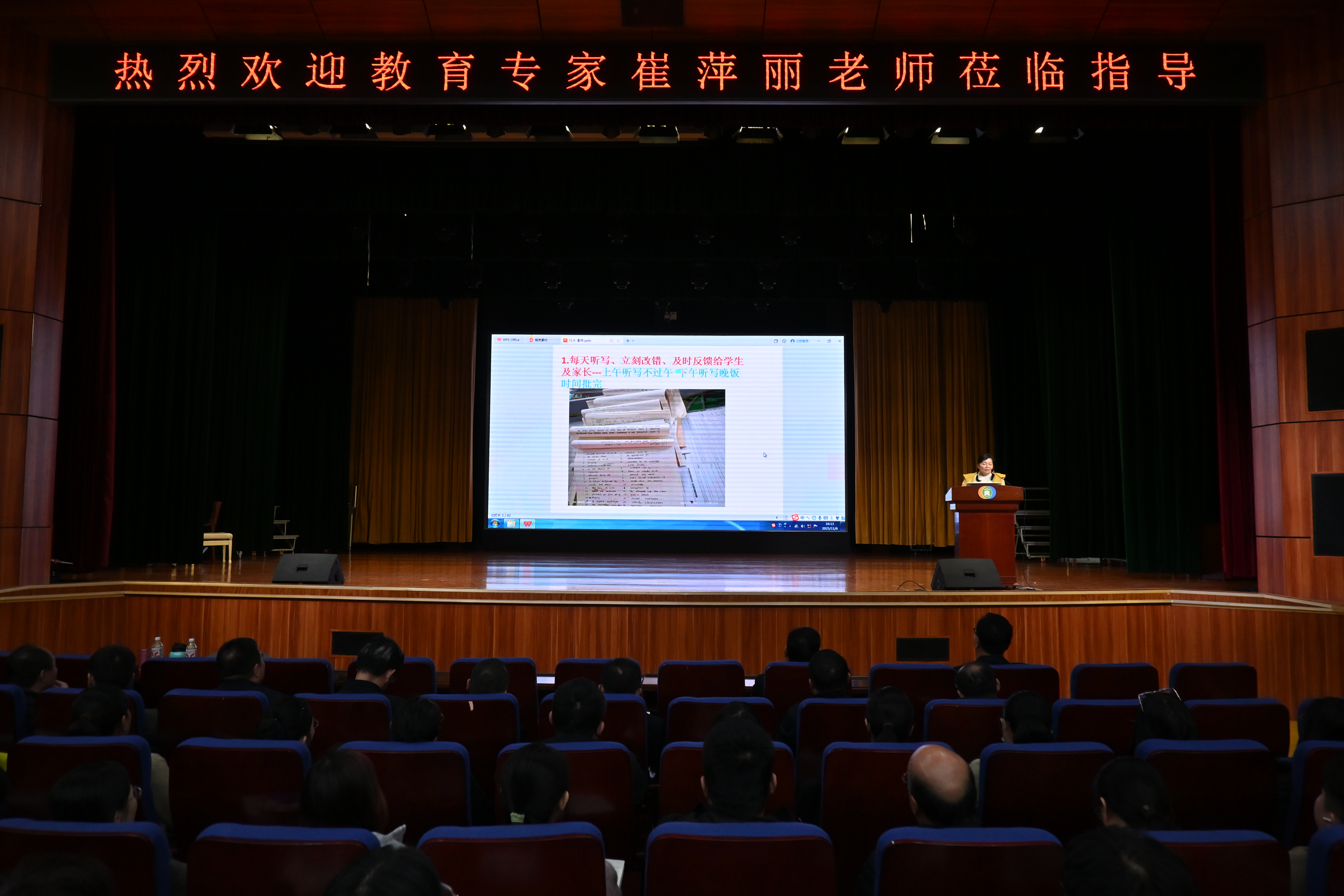 讲座中,崔老师结合自身二十余年教学经验,围绕语法教学技巧、写作能力提升、学生管理方法等核心话题展开分享。她通过真实教学案例,详细拆解了“语法金法则”的应用场景,生动诠释了“写作万能金句”的创作逻辑,更毫无保留地分享了转化问题学生、打造优秀教学团队的宝贵经验。 现场教师认真聆听、仔细记录,不时与崔老师互动交流。