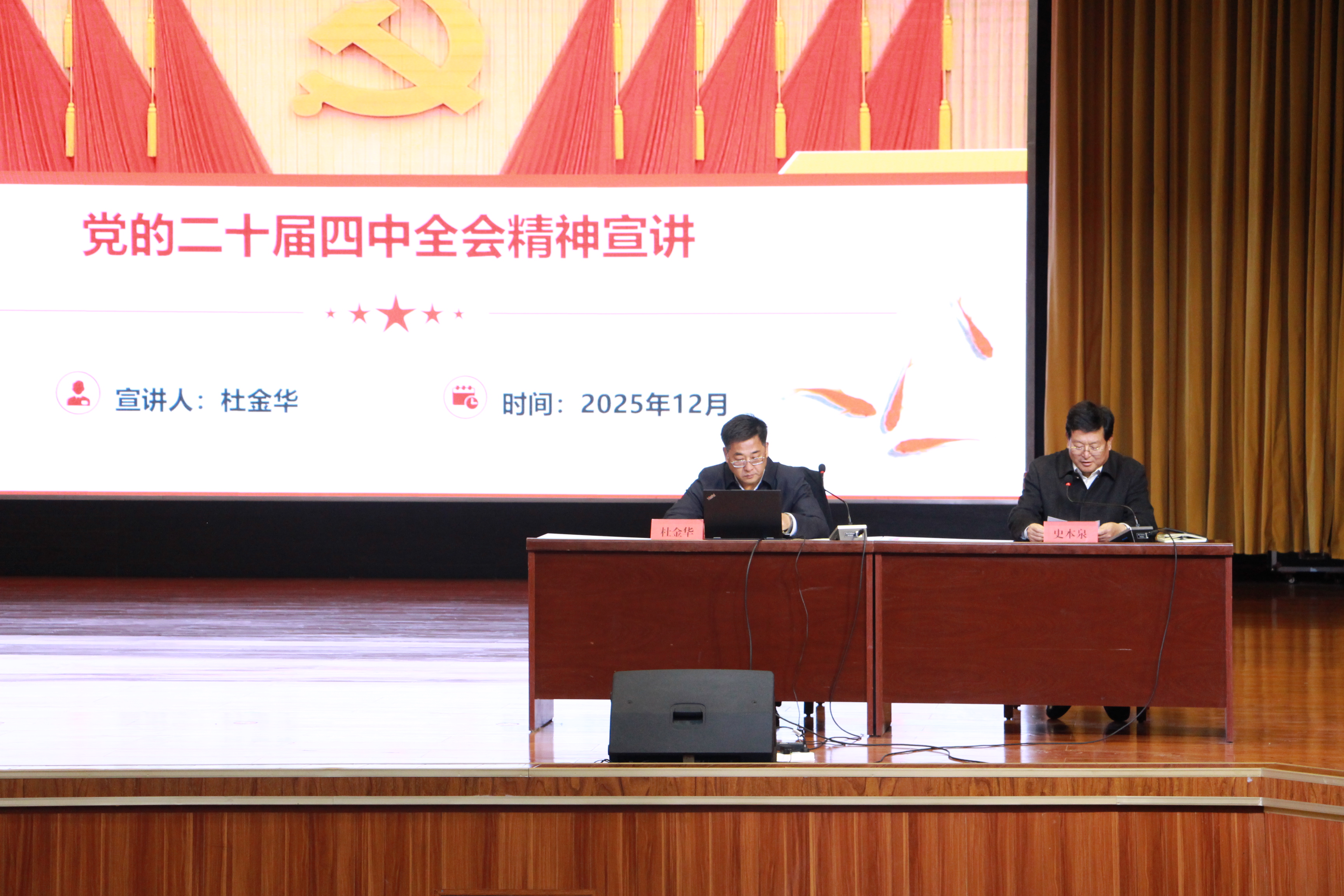 12月4日,市一中举行学习贯彻党的二十届四中全会精神宣讲报告会。市委党校(山东生态文明学院)分管日常工作的副校长(副院长)、东营行政学院院长、一级调研员杜金华同志作宣讲报告,市一中党委书记、校长史本泉主持会议,学校党委班子成员、中层干部及全体党员教职工500余人参会学习。