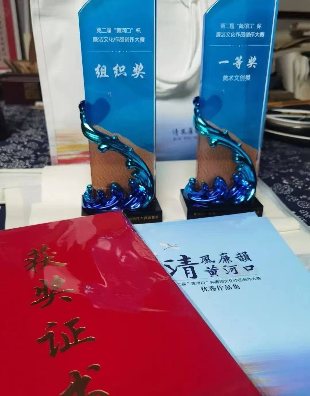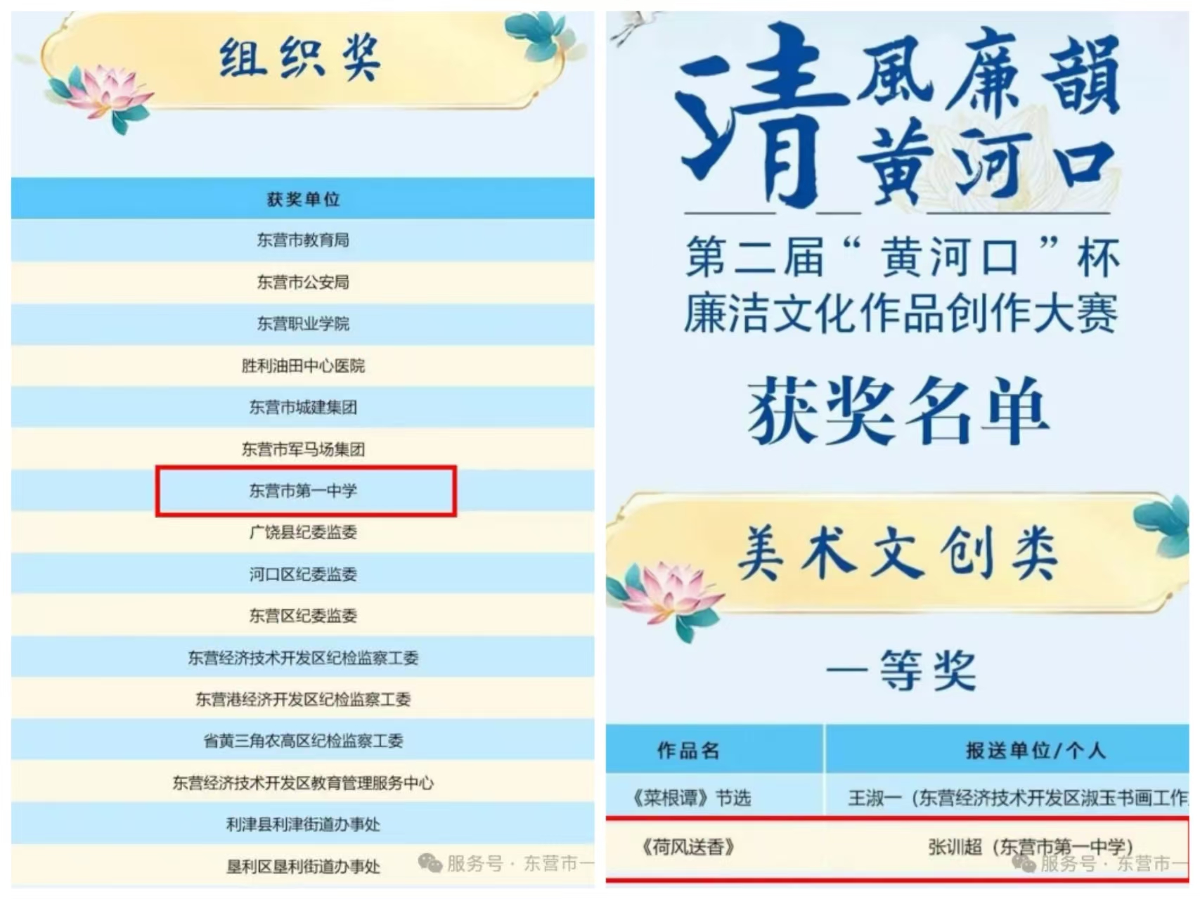 近日,第二届“黄河口”杯廉洁文化作品创作大赛优秀作品展示活动在东营市老年大学金秋剧场举行,我校斩获优秀组织奖,张训超老师的作品从2322件美术文创类参赛作品中脱颖而出,荣获美术文创类一等奖(全市仅2名)。郑绍林、王清岩、刘硕琛获优秀作品奖。