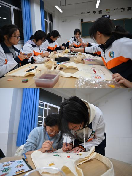 近日,我校美术社与书法社于近期联合举办“殚青翰墨,艺彩生活”主题创作活动。本次活动以日常必备的空白帆布包为创意载体,将丙烯颜料的鲜活色彩与传统书法的笔墨韵味融入生活用品,让艺术走出画室、走进三餐四季,既让“敬学”精神在生活化的创作中落地生根,更让每位同学都能感受到艺术的亲和力与创造力,赢得了全校师生的广泛关注与热烈响应。