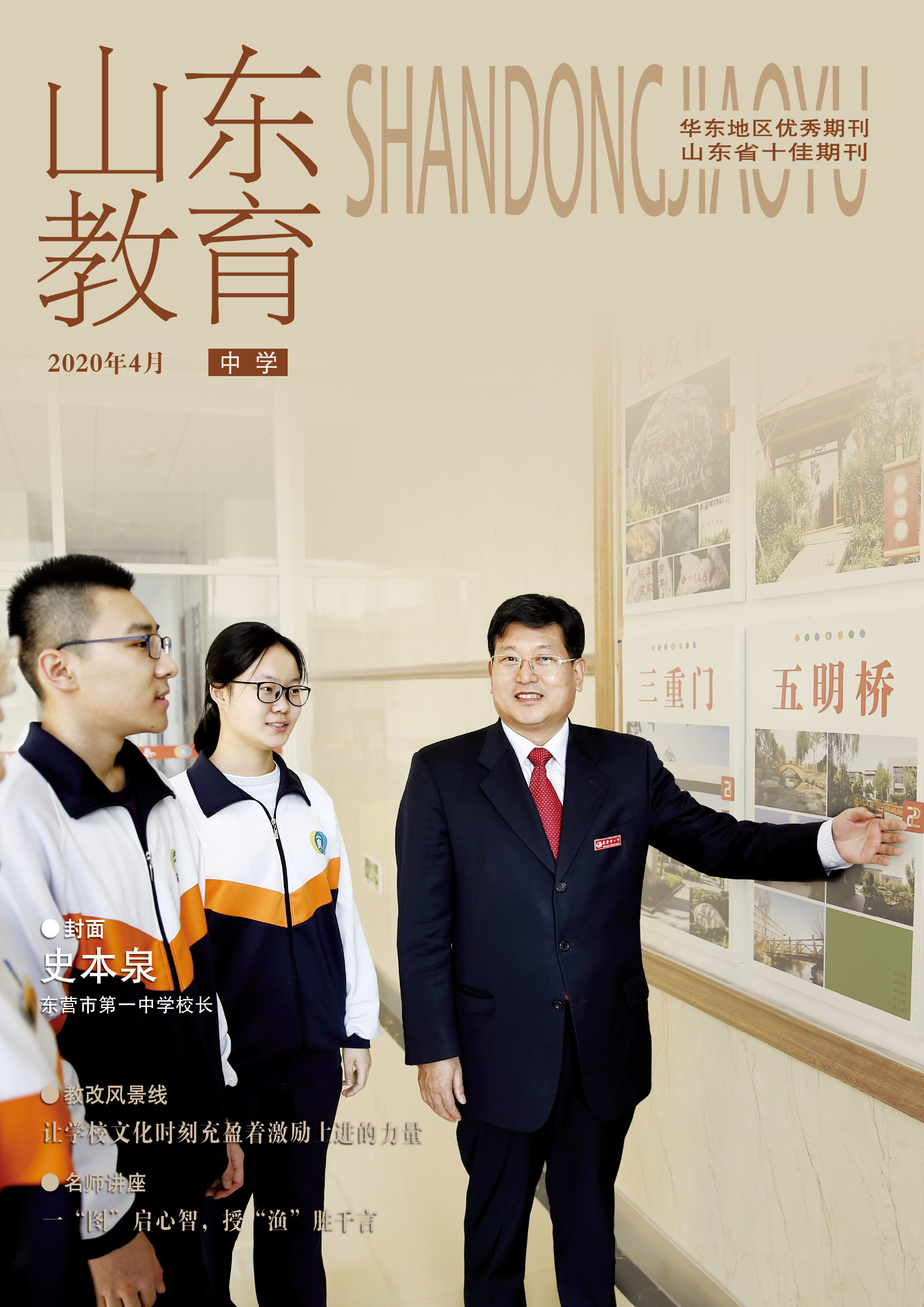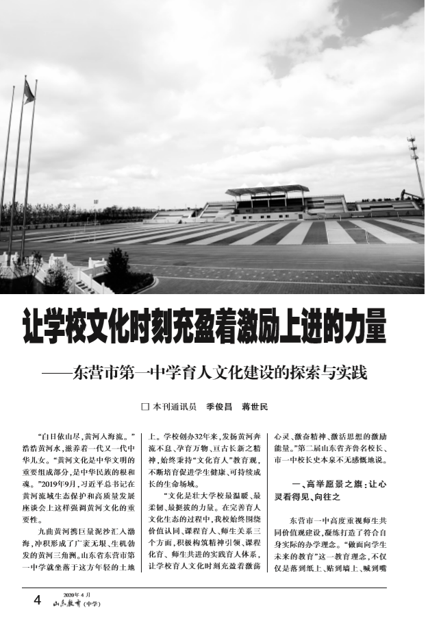 2020年4月,由山东省教育厅主管、山东教育社主办的《山东教育》(中学刊)以《让学校文化时刻充盈着激励上进的力量——东营市第一中学育人文化建设的探索与实践》为题,长篇重磅(7个页码)推介市一中建设育人文化的做法及经验,并推出封面人物史本泉校长。