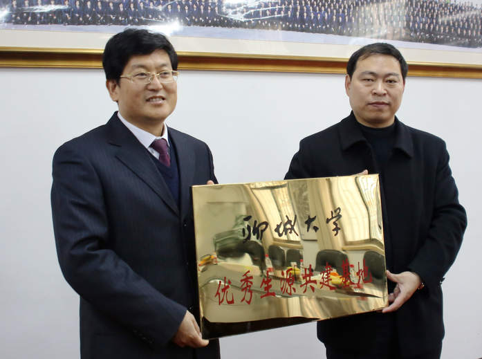 在学校接待室,史本泉校长和崔吉学处长签订了《聊城大学优秀生源基地共建协议》,崔吉学处长向史本泉校长授“聊城大学优秀生源共建基地”匾牌。付贞祥副校长参加了授牌仪式。