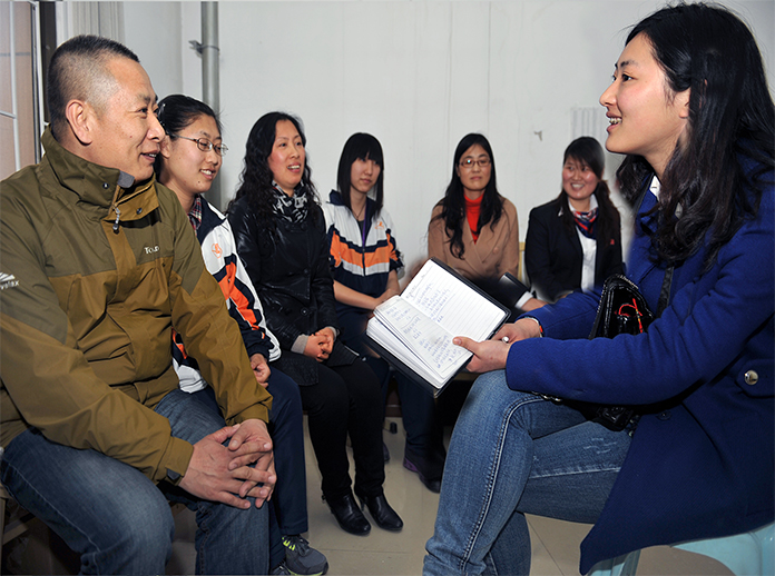 (图为记者李晓琳与教师、家长、学生座谈)