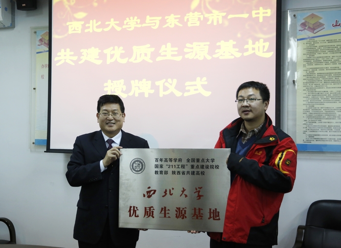 1月16日,“西北大学优质生源基地”授牌仪式在市一中接待室举行。西北大学教务处副处长周超,西北大学教授、博师生导师张金功,西北大学招生办主任刘春雷一行三人在西北大学校友、滨海公安局滨北分局法制大队长林辛乐等人的陪同下莅临我校举行授牌仪式。学校党委书记、校长史本泉热情接待了来访客人。(通讯员 丁子勇)