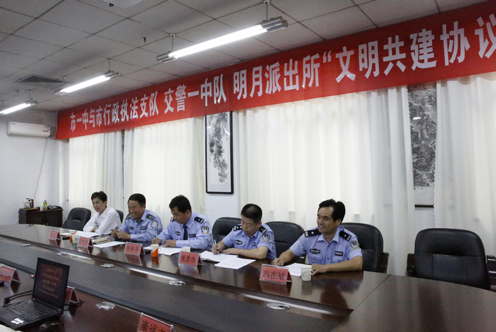 在文明共建签字仪式上,学校纪委书记、工会主席张利波代表学校分别与市行政执法支队、交警一中队、明月派出所签署了“文明共建协议”。