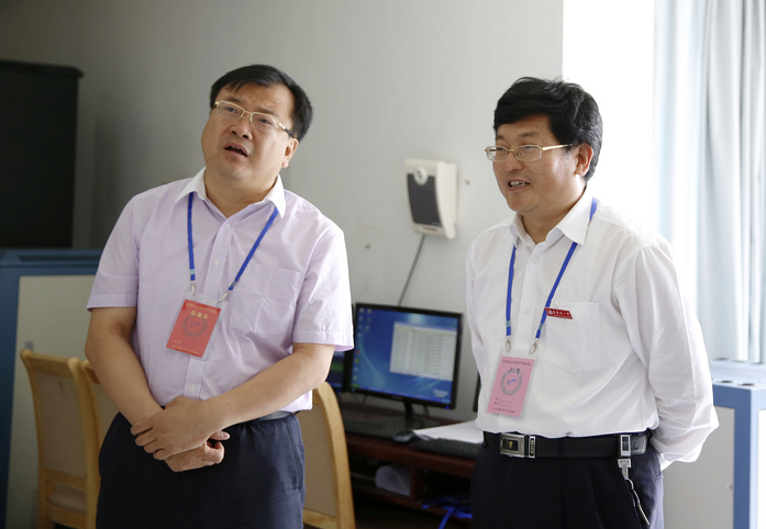 年初中学生学业考试开考第一天,市教育局局长梁海伟在市教育局相关科室负责人的陪同下到市一中视察考务工作。市一中党委书记、校长史本泉就考务组织工作做了专题汇报。图为: