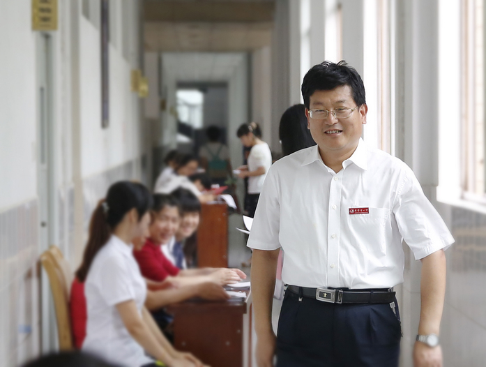 盛夏时节的一中校园,绿意盎然,生机勃勃。7月4日一大早,市一中校园里彩旗招展、热闹非凡。老师们和学生志愿者们紧张的忙碌着,布置签到台,设置欢迎标语、准备饮水机,史本泉校长也来到迎新生交费注册现场对各项工作进行检查和指导……。原来今天是市一中2014级高一新生入学交费注册的日子。