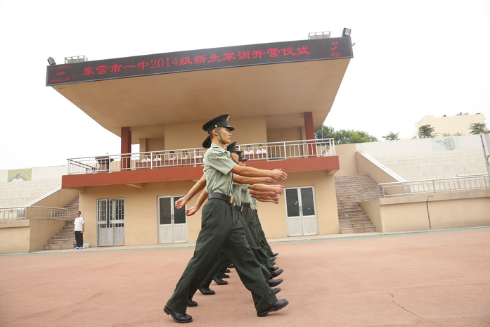 级新生军训开营仪式伴着清爽的秋风,沐着和暖的阳光在学校运动场举行。承训部队东营公安消防支队参谋长孔向东,中国人民解放军济南军区生产基地军务科科长袁春雷,济军基地值勤队队长崔永国,市一中党委书记、校长史本泉出席开营仪式。学校部分职能科室主任、全体承训教官、高一年级部班主任及