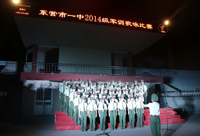 8月27日晚,市一中2014级军训团歌咏比赛在学校运动场举行。