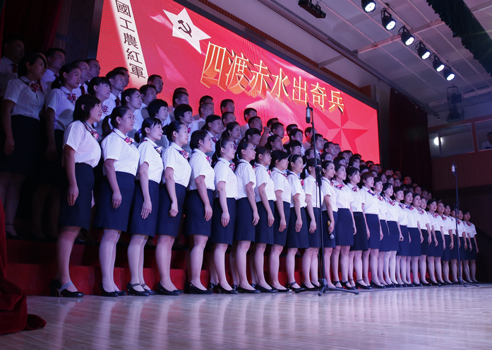 晚,在全校教职工大会上,我校教职工“百人大合唱”气势恢宏,雄壮有力,精彩演绎了长征组歌系列之《四渡赤水》和《走向复兴》,以优美的旋律,嘹亮的歌声展现了一中人的信心和豪情。(通讯员 丁子勇)