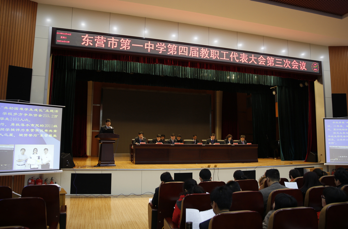 新春的鞭炮声还在耳边回响,新学期的征程已在我们面前展开。2015年3月4日上午,东营市一中第四届教职工代表大会第三次会议在学校礼堂隆重举行。全校教职工齐聚一堂,共商学校发展大计。学校党委书记、校长史本泉作了题为《群策群力共谋升级发展,同心同德再创辉煌篇章》的工作报告。(通讯员丁子勇)