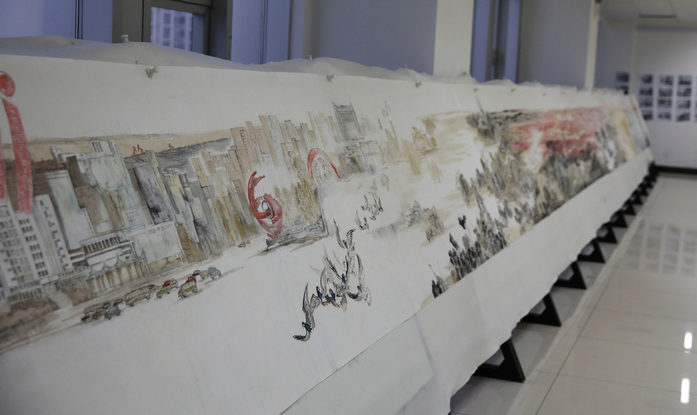 近日,一幅长120米,宽105米的巨幅画卷《黄河九曲万里入海图》在东营区文化活动中心五楼展馆顺利展出。1月23日下午,学校党委书记、校长史本泉在东营区政协主席王跃军、副主席王昌勇和区文联主席潘屴的陪同下观看了画展。我校美术教师张训超做为主创人员之一,以深厚的艺术功底和精湛的绘画技艺深受各方人员好评。(通讯员 丁子勇)