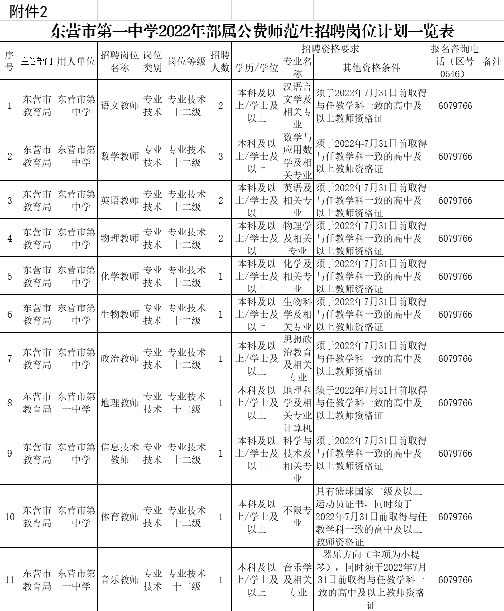 招聘岗位、人数等具体要求见《东营市第一中学2022年部属公费师范生招聘岗位计划表》(附件2)。