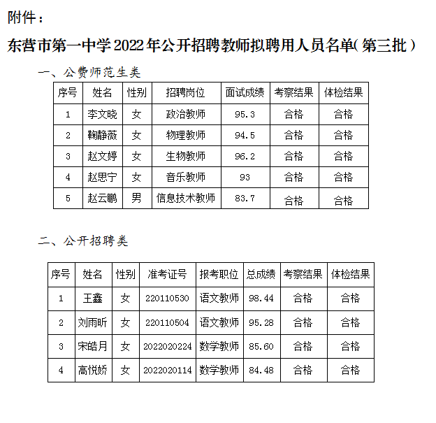 按照《山东省事业单位公开招聘人员实施办法》和《东营市第一中学2022年公开招聘教师简章》规定,现将东营市第一中学2022年公开招聘教师拟聘用人员(第三批)进行公示,公示期7个工作日(2022年8月10日至2022年8月18日)。公示期间如有异议,请拨打监督电话0546-6079766。