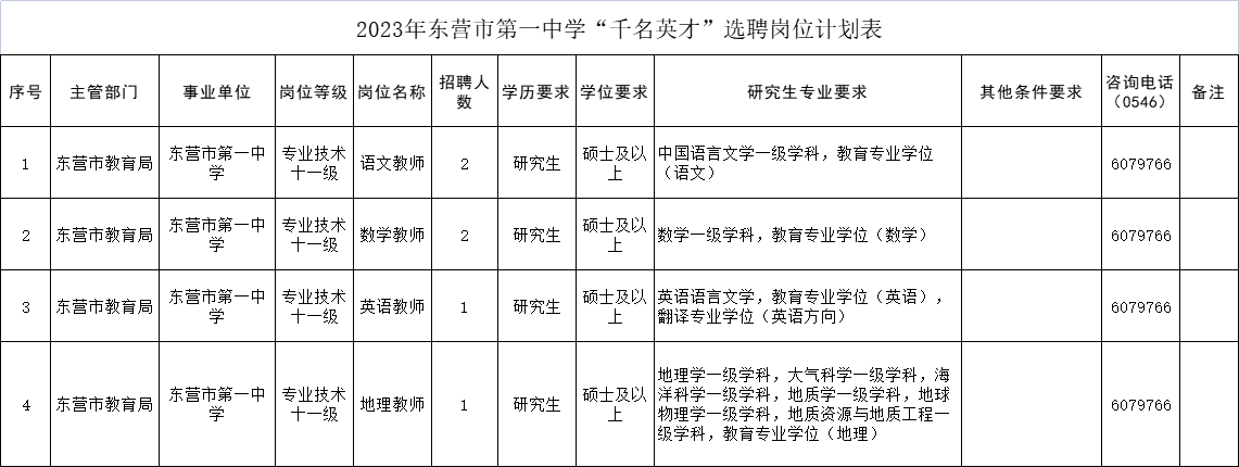 附1: 2023年东营市第一中学“千名英才”选聘岗位计划表