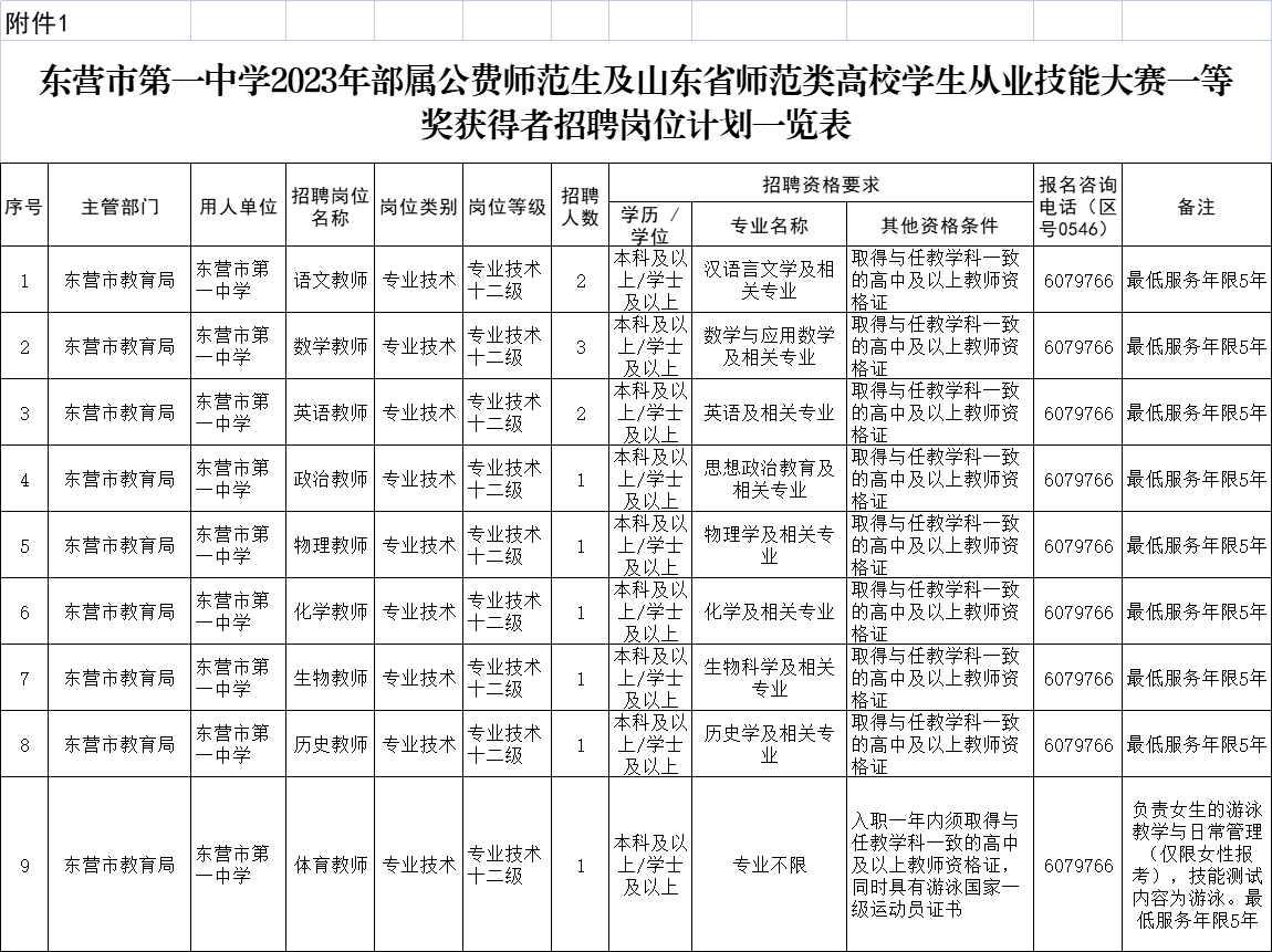 招聘岗位、人数等具体要求见《东营市第一中学2023年部属公费师范生及山东省师范类高校学生从业技能大赛一等奖获得者招聘岗位计划一览表》(附件1)。