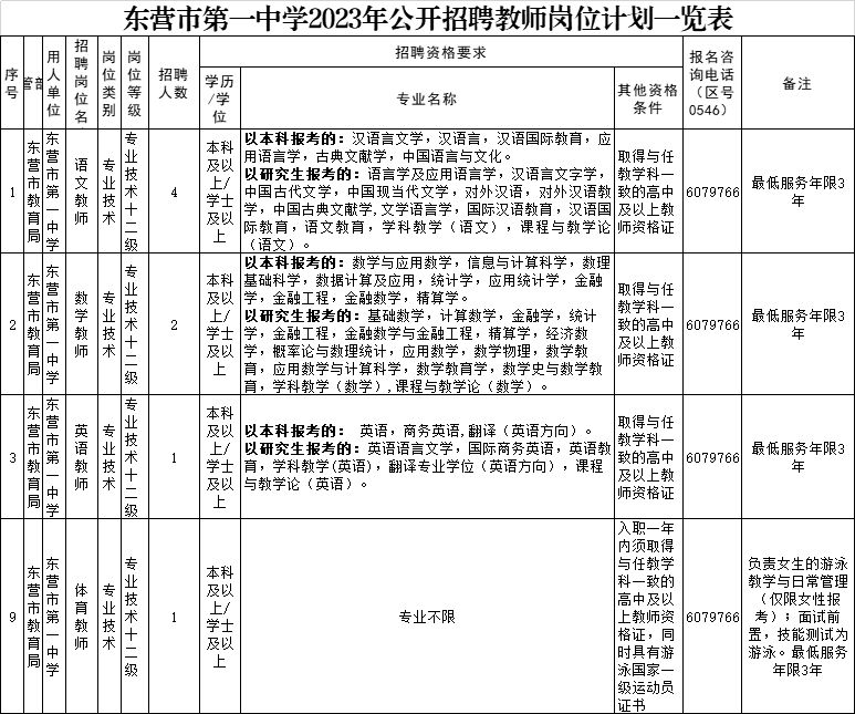 招聘岗位条件、招聘人数等具体要求见《东营市第一中学2023年公开招聘教师岗位计划一览表》(附件1)。