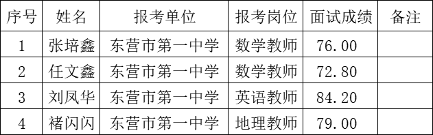 东营市第一中学2023年“千名英才”选聘考核评价面试工作已结束,根据《2023年东营市市属事业单位“千名英才”选聘公告》和面试成绩排名,按照招聘岗位计划等额确定入围体检考察人员名单,名单公告如下: