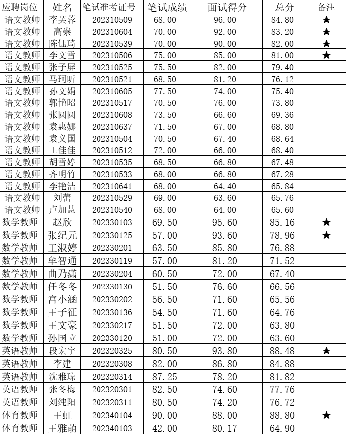 注:备注栏加★者为进入体检考察范围人选,体检注意事项请关注东营市第一中学网站相关信息。