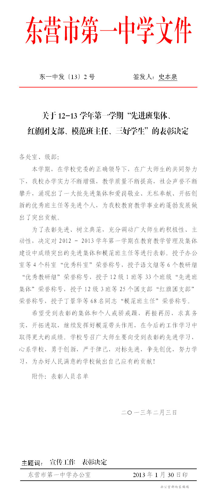 关于2012-2013学年第一学期“先进班集体”等的表彰决定
