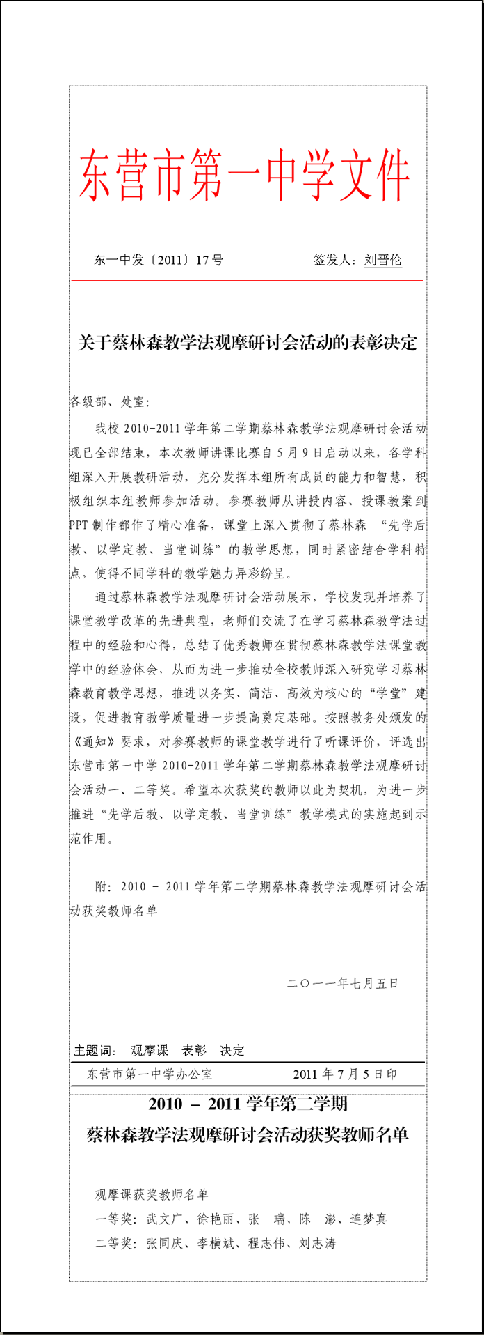 关于蔡林森教学法观摩研讨会活动的表彰决定