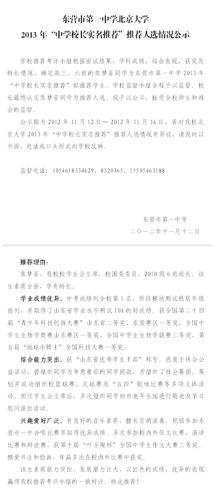 2013年“中学校长实名推荐”推荐人选情况公示及焦梦菲推荐理由