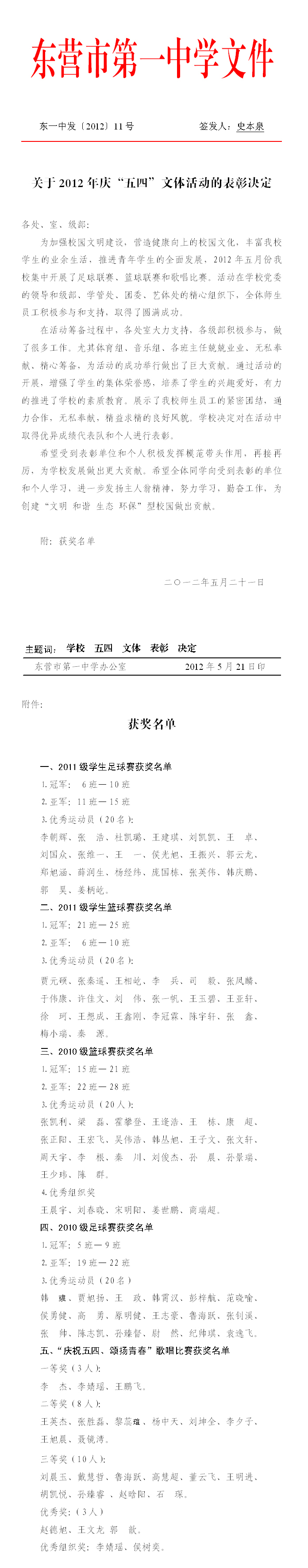 关于庆“五四”文体活动表彰决定