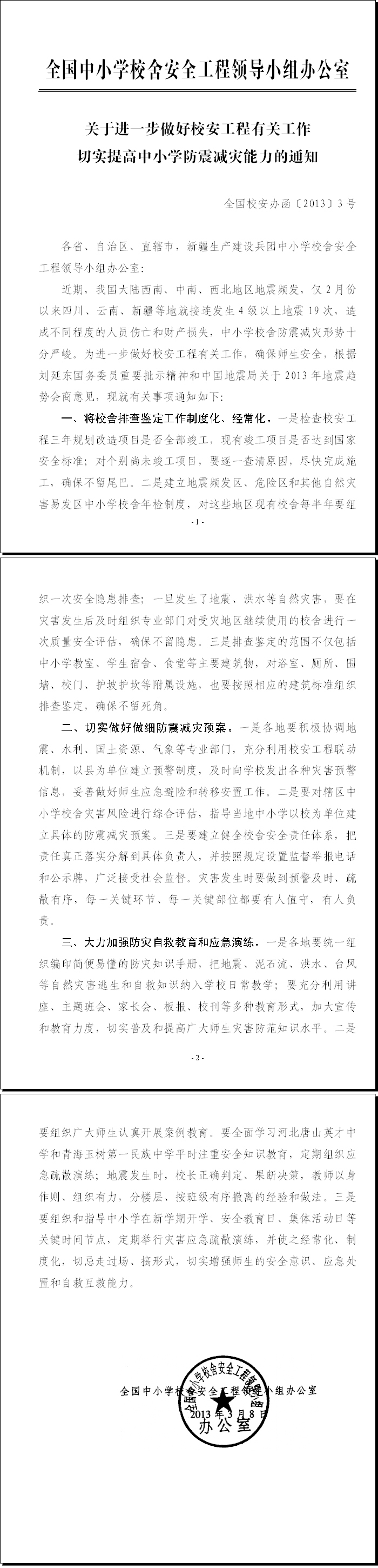 附件:《关于进一步做好校安工程有关工作切实提高中小学防震减灾能力的通知》(全国校安办函[2013]3号)