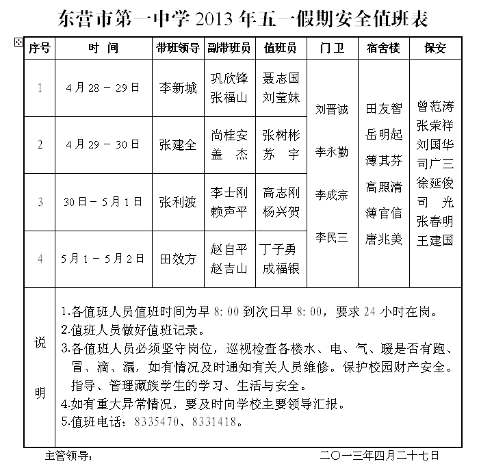 2013年五一假期安全值班表