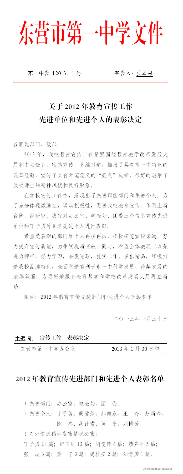 关于2012年教育宣传工作先进部门和个人的表彰决定
