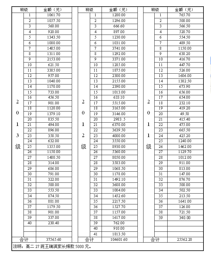 各班级为孙伟强同学捐款明细