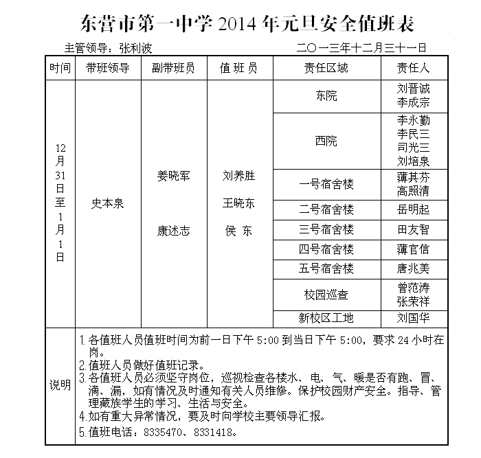 2014年元旦安全值班表