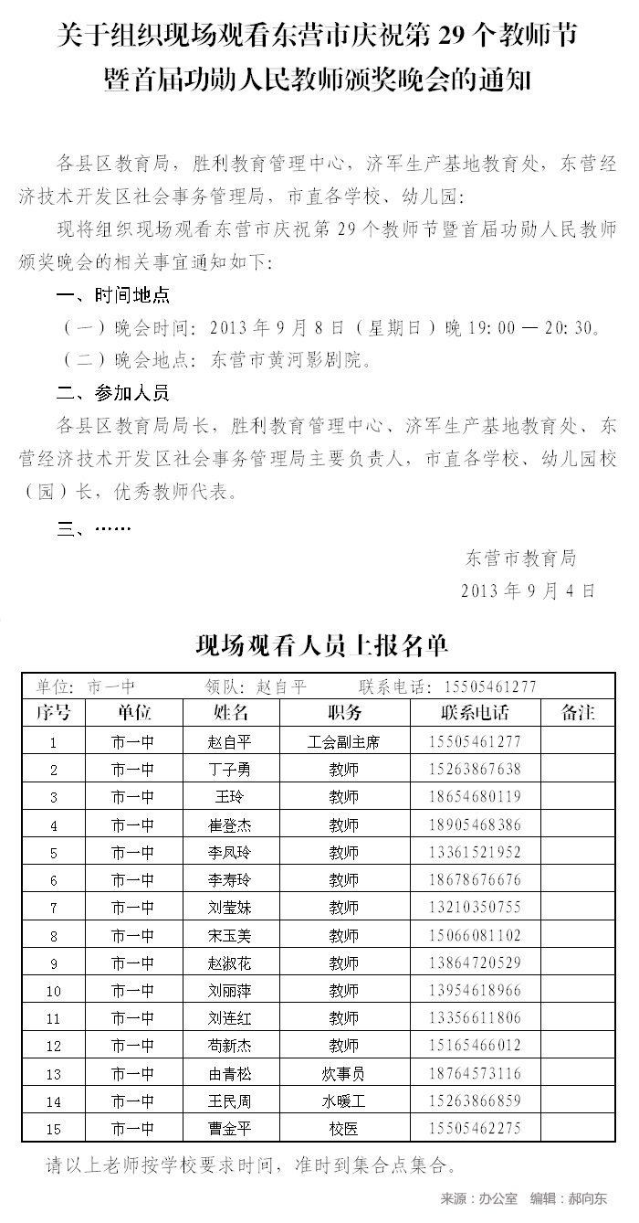 关于组织现场观看东营市庆祝第29个教师节暨首届功勋人民教师颁奖晚会的通知