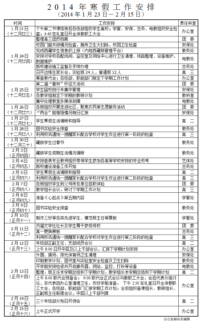 2014年寒假及假前重要工作安排