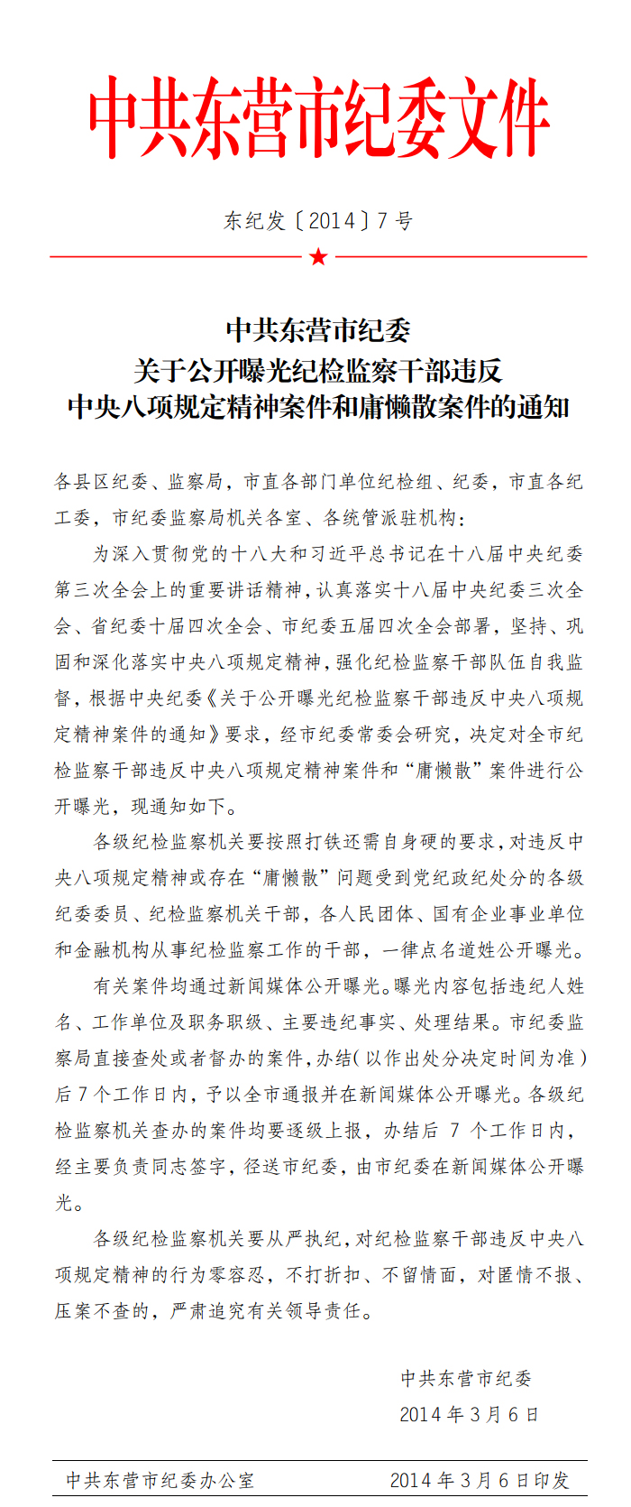 中共东营市纪委关于公开曝光纪检监察干部违反中央八项规定精神案件和庸懒散案件的通知